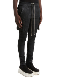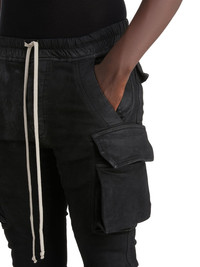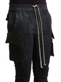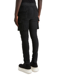 RICK OWENS FW21 GETHSEMANE MASTODON CUT IN BLACKETY BLACK STRETCH DENIM THESE MASTODON CUT PANTS ARE FULL LENGTH AND SLIM FITTING WITH AN ELASTICIZED ANKLES AND WAISTBAND WITH DRAWSTRING. THEY FEATURE, TWO SIDE WELT POCKETS, TWO BACK POCKETS AND TWO SIDE CARGO PANNIER POCKETS WITH FLAPS AT MID-THIGH THIS LIGHTWEIGHT STRETCH DENIM HAS A BLACK MATTE TREATMENT APPLIED ON THE FINISHED GARMENT - COLOR: BLACK - MATERIAL: 91% COTTON, 6% POLYETHYLENE TEREPHTALATE, 3% ELASTANE - BAND: 97% COTTON, 3% ELASTANE - POCKETS LINING: 100% COTTON - MODEL IS WEARING SIZE S - MODEL IS 189 CM TALL