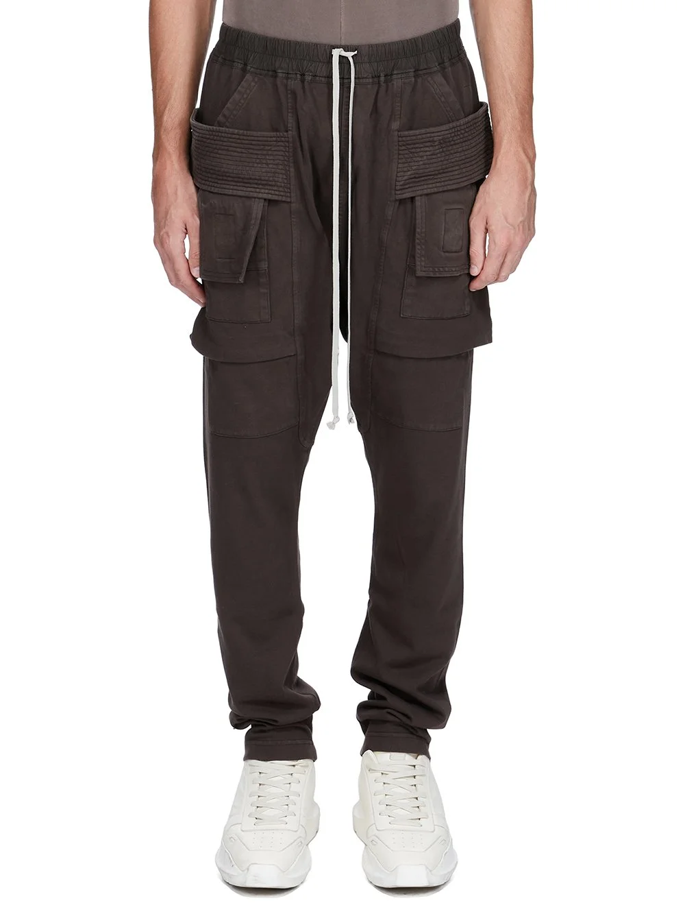 DRKSHDW FW25 CONCORDIANS CREATCH CARGO DRAWSTRING IN DARKDUST COMPACT HEAVY JERSEY THESE CREATCH CARGO DRAWSTRING PANTS ARE FULL LENGTH. THEY HAVE AN ELASTICIZED WAISTBAND WITH DRAWSTRING AND STITCHED FLY. THEY FEATURE LAYERED FRONT POCKETS WITH SIDE BELT STRAPS WITH SIGNATURE STITCHING LINES AND TWO BACK SQUARE PATCH POCKETS WITH FLAPS AND TOPSTITCHING. THIS HEAVYWEIGHT AND COMPACT COTTON JERSEY HAS A BRUSHED AND SOFT HANDFEEL. THIS JERSEY IS GARMENT DYED THIS FABRIC IS MADE USING GOTS CERTIFIED ORGANIC COTTON WHICH MEANS THE NATURAL FIBER IS GROWN WITHOUT HARMFUL CHEMICALS, LEAVING OUR SOIL, AIR AND WATER CLEANER FROM CONTAMINATES COLOR: DARKDUST MATERIAL: 100% COTTONBAND 97% COTTON + 3% ELASTANE MODEL IS 189CM TALL MODEL WEARS SIZE S