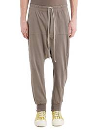 RICK OWENS FW21 GETHSEMANE PRISONER DRAWSTRING IN COMPACT HEAVY COTTON JERSEY THESE PRISONER DRAWSTRING PANTS ARE FULL LENGTH WITH A RELAXED DROPPED CROTCH AND SLIM CUT LEGS. THEY HAVE AN ELASTICIZED WAISTBAND WITH DRAWSTRING AND STITCHED FLY, RIBBED ANKLE CUFFS, SIDE AND BACK POCKETS WITH FLAPS AND FEATURES A CURVED TOPSTICHED YOKE SEAM RUNNING ACROSS THE FRONT AND DOWN EACH LEG THIS COMPACT HEAVY COTTON JERSEY IS GARMENT DYED WITH A LIGHTLY BRUSHED FINISH. THIS JERSEY IS MADE FROM GOTS CERTIFIED ORGANIC COTTON. WE CHOSE TO MAKE THIS GARMENT USING CERTIFIED ORGANIC COTTON BECAUSE IT MEANS THE NATURAL FIBER IS GROWN WITHOUT HARMFUL CHEMICALS, WHICH LEAVES OUR SOIL, AIR AND WATER CLEANER FROM CONTAMINATES - COLOR: DUST - MATERIAL: 100% COTTON - BAND: 97% COTTON, 3% ELASTANE - MODEL IS WEARING SIZE S - MODEL IS 189 CM TALL