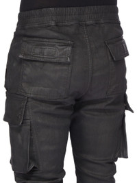 DRKSHDW FW25 CONCORDIANS MASTODON CUT IN BLACK WAX STRETCH DENIM THESE MASTODON CUT PANTS ARE FULL LENGTH WITH A SLIM FIT. THEY HAVE AN ELASTICIZED WAISTBAND WITH DRAWSTRING AND ELASTICIZED CUFFS. THEY FEATURE TWO SIDE WELT POCKETS, TWO ZIPPERED CARGO POCKETS WITH BEVELED FLAPS ON THE OUTER THIGH, AND BACK PATCH POCKETS WITH FLAPS AND TOPSTITCHING. THIS LIGHTWEIGHT BLACK WAX DENIM IS MADE ON A 10OZ BLACK AND NATURAL STRETCH DENIM. THE READY GARMENT IS OVERDYED BLACK AND TREATED WITH A WAX FINISH. A FINAL WASH GIVES THIS GARMENT ITS SOFTNESS. THIS GARMENT IS TREATED IN AN ITALIAN WASH HOUSE BASED IN THE VENETO AREA OF ITALY, THAT PRODUCES IN SMALLER TREATMENT BATHS TO REDUCE WATER WASTE AND UTILIZE A WATER PURIFYING PROCESS THAT ENABLES THEM TO RECYCLE A PORTION OF THE WATER USED. ALL OF OUR DENIM WASHES ARE ZDHC CERTIFIED. COLOR: BLACK WAX MATERIAL: 91% COTTON + 6% ELASTOMULTIESTER + 3% RUBBER FIBER POCKETS LINING 100% COTTON MODEL IS 189CM TALL MODEL WEARS SIZE S