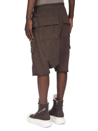 DRKSHDW FW25 CONCORDIANS CREATCH CARGO PODS IN DRKDUST COMPACT HEAVY JERSEY THESE CREATCH CARGO PODS. ARE BELOW KNEE LENGTH, WITH A DROPPED CROTCH AND WIDE CENTRE PANEL. THEY HAVE AN ELASTICIZED WAISTBAND WITH DRAWSTRING AND STITCHED FLY. THEY FEATURE LAYERED FRONT POCKETS WITH SIDE BELT STRAPS WITH SIGNATURE STITCHING LINES AND TWO FLAP POCKETS WITH FLAPS AND TOPSTITCHING. THIS HEAVYWEIGHT AND COMPACT COTTON JERSEY HAS A BRUSHED AND SOFT HANDFEEL. THIS JERSEY IS GARMENT DYED THIS FABRIC IS MADE USING GOTS CERTIFIED ORGANIC COTTON WHICH MEANS THE NATURAL FIBER IS GROWN WITHOUT HARMFUL CHEMICALS, LEAVING OUR SOIL, AIR AND WATER CLEANER FROM CONTAMINATES COLOR: DRKDUST MATERIAL: 100% COTTONBAND 97% COTTON + 3% ELASTANE MODEL IS 189CM TALL MODEL WEARS SIZE S