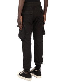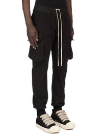 DRKSHDW SS26 TEMPLE MASTODON CUT IN DEEP BLACK STRETCH DENIM THESE MASTODON CUT PANTS ARE FULL LENGTH WITH A SLIM FIT. THEY HAVE AN ELASTICIZED WAISTBAND WITH DRAWSTRING AND ELASTICIZED CUFFS. THEY FEATURE TWO SIDE WELT POCKETS, TWO ZIPPERED CARGO POCKETS WITH BEVELED FLAPS ON THE OUTER THIGH, AND BACK PATCH POCKETS WITH FLAPS AND TOPSTITCHING. THIS MEDIUMWEIGHT 13OZ DENIM IS OVERDYED AND HAS A SOFT AND WASHED HANDFEEL. THIS FABRIC IS MADE USING GOTS CERTIFIED ORGANIC COTTON WHICH MEANS THE NATURAL FIBER IS GROWN WITHOUT HARMFUL CHEMICALS, LEAVING OUR SOIL, AIR AND WATER CLEANER FROM CONTAMINATES. COLOR: BLACK MATERIAL:100% COTTON BAND 97% COTTON + 3% ELASTANE MODEL WEARS SIZE 44