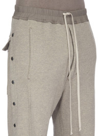 DRKSHDW FW25 CONCORDIANS PUSHER PANTS IN MELANGE GREY FELPA JERSEY THESE PUSHER PANTS ARE FLOOR LENGTH WITH A WIDE LEG AND A SLIGHTLY DROPPED CROTCH. THEY HAVE AN ELASTICIZED WAISTBAND WITH DRAWSTRING, SIDE FRONT JET POCKETS AND SQUARE BACK POCKETS WITH TOPSTITCHING. THEY FEATURE VISIBLE SNAP CLOSURES RUNNING DOWN THE OUTER LEG, ALLOWING THEM TO BE UNSNAPPED AND WORN OPEN. THIS HEAVYWEIGHT COTTON AND POLYESTER BLEND MELANGE JERSEY HAS A SOFT HANDFEEL. THIS FABRIC IS MADE USING GOTS CERTIFIED ORGANIC COTTON WHICH MEANS THE NATURAL FIBER IS GROWN WITHOUT HARMFUL CHEMICALS, LEAVING OUR SOIL, AIR AND WATER CLEANER FROM CONTAMINATES. COLOR: MELANGE GREY MATERIAL: 84% COTTON 16% POLYESTER MODEL IS 189CM TALL MODEL WEARS SIZE S