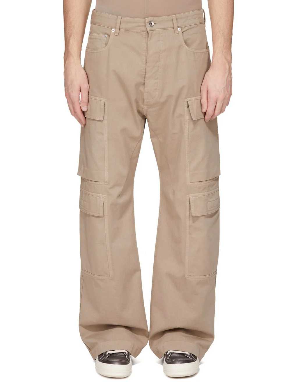 DRKSHDW FW25 CONCORDIANS DOUBLE CARGO JEANS IN DIRTY PEARL COTTON TWILL THESE DOUBLE CARGO JEANS ARE A FULL LENGTH 5-POCKET JEAN WITH A LOW-RISE AND A LOOSE FIT. THEY HAVE A CONCEALED SILVER ZIPPER FLY WITH TOP BUTTON, BELT LOOPS AND POCKET RIVETS AND THEY FEATURE TWO BEVELED CARGO POCKETS ON THE THIGH, WITH TWO SQUARE CARGO POCKETS BELOW AND TWO SQUARE BACK POCKETS. THEY ALL HAVE FLAPS AND TOPSTITCHING. THIS MEDIUMWEIGHT WORKWEAR COTTON TWILL IS GARMENT DYED WITH A SOFT AND WASHED HANDFEEL THIS FABRIC IS MADE USING GOTS CERTIFIED ORGANIC COTTON WHICH MEANS THE NATURAL FIBER IS GROWN WITHOUT HARMFUL CHEMICALS, LEAVING OUR SOIL, AIR AND WATER CLEANER FROM CONTAMINATES COLOR: DIRTY PEARL MATERIAL: 100% COTTON MODEL IS 189CM TALL MODEL WEARS SIZE 31