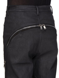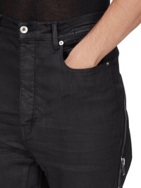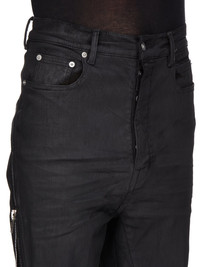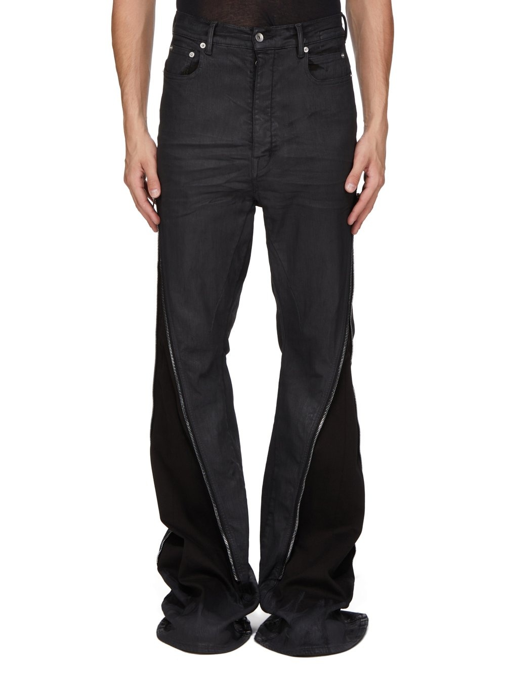 DRKSHDW SS25 HOLLYWOOD BOLAN BANANA IN BLACK WAX BLACK WAX STRETCH DENIM THIS BOLAN BANANA IS A HIGH WAISTED, SLIM FIT 6-POCKET JEAN WITH A FLOOR-LENGTH BOOT CUT. THEY HAVE A WAISTBAND WITH BELT LOOPS AND POCKET RIVETS, AND CLOSE WITH A CONCEALED BUTTON FLY. THEY FEATURE A LONG ZIPPER RUNNING FROM CENTRE BUTT, CURVING AROUND THE HIP TO THE HEM. IT CAN UNZIPPER AT BACK TO EXPOSE THE BUTT AND ALSO UP FROM THE HEM TO EXPOSE AN INNER, FLARED PANEL IN THE LEG THIS LIGHTWEIGHT BLACK WAX DENIM IS MADE ON A 10OZ BLACK AND NATURAL STRETCH DENIM. THE READY GARMENT IS OVERDYED BLACK AND TREATED WITH A WAX FINISH. A FINAL WASH GIVES THIS GARMENT ITS SOFTNESS. THIS GARMENT IS TREATED IN AN ITALIAN WASH HOUSE BASED IN THE VENETO AREA OF ITALY, THAT PRODUCES IN SMALLER TREATMENT BATHS TO REDUCE WATER WASTE AND UTILIZE A WATER PURIFYING PROCESS THAT ENABLES THEM TO RECYCLE A PORTION OF THE WATER USED. ALL OF OUR DENIM WASHES ARE ZDHC CERTIFIED COLOR: BLACK WAX MATERIAL: 91% COTTON + 6% ELASTOMULTIESTER + 3% RUBBER POCKETS LINING 100% COTTON MODEL IS 189CM TALL MODEL WEARS SIZE 31