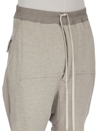 DRKSHDW FW25 CONCORDIANS PRISONER DRAWSTRING IN MELANGE GREY FELPA JERSEY THESE PRISONER DRAWSTRING PANTS ARE FULL LENGTH, WITH A RELAXED DROPPED CROTCH AND SLIM CUT LEGS. THEY HAVE AN ELASTICIZED WAISTBAND WITH DRAWSTRING AND STITCHED FLY, RIBBED ANKLE CUFFS, FRONT SIDE SEAM POCKETS AND SQUARE BACK POCKETS WITH FLAPS AND TOPSTITCHING. THEY FEATURE A CURVED YOKE SEAM RUNNING ACROSS THE FRONT AND DOWN EACH LEG. THIS HEAVYWEIGHT COTTON AND POLYESTER BLEND MELANGE JERSEY HAS A SOFT HANDFEEL THIS FABRIC IS MADE USING GOTS CERTIFIED ORGANIC COTTON WHICH MEANS THE NATURAL FIBER IS GROWN WITHOUT HARMFUL CHEMICALS, LEAVING OUR SOIL, AIR AND WATER CLEANER FROM CONTAMINATES COLOR: MELANGE GREY MATERIAL: 84% COTTON + 16% POLYESTERBAND 100% COTTON KNIT RIB BOTTOM 57% COTTON + 38% POLYESTER + 5% ELASTANE MODEL IS 189CM TALL MODEL WEARS SIZE S