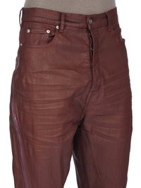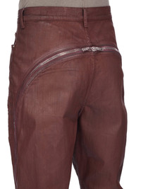 DRKSHDW FW25 CONCORDIANS BOLAN BANANA IN SCAB WAX STRETCH DENIM THIS BOLAN BANANA IS A HIGH WAISTED, SLIM FIT 6-POCKET JEAN WITH A FLOOR-LENGTH BOOT CUT. THEY HAVE A WAISTBAND WITH BELT LOOPS AND POCKET RIVETS AND CLOSE WITH A CONCEALED BUTTON FLY. THEY FEATURE A LONG ZIPPER RUNNING FROM CENTRE BUTT, CURVING AROUND THE HIP TO THE HEM. IT CAN UNZIPPER AT BACK TO EXPOSE THE BUTT AND ALSO UP FROM THE HEM TO EXPOSE AN INNER, FLARED PANEL IN THE LEG. THIS LIGHTWEIGHT SCAB WAX DENIM IS MADE ON A 10OZ INDIGO AND NATURAL STRETCH DENIM. THE READY GARMENT IS OVERDYED SCAB AND TREATED WITH A WAX FINISH. A FINAL WASH GIVES THIS GARMENT ITS SOFTNESS THIS GARMENT IS TREATED IN AN ITALIAN WASH HOUSE BASED IN THE VENETO AREA OF ITALY, THAT PRODUCES IN SMALLER TREATMENT BATHS TO REDUCE WATER WASTE AND UTILIZE A WATER PURIFYING PROCESS THAT ENABLES THEM TO RECYCLE A PORTION OF THE WATER USED. ALL OF OUR DENIM WASHES ARE ZDHC CERTIFIED COLOR: SCAB WAX MATERIAL: 91% COTTON + 6% ELASTOMULTIESTER + 3% RUBBER FIBER MODEL IS 189CM TALL MODEL WEARS SIZE 31