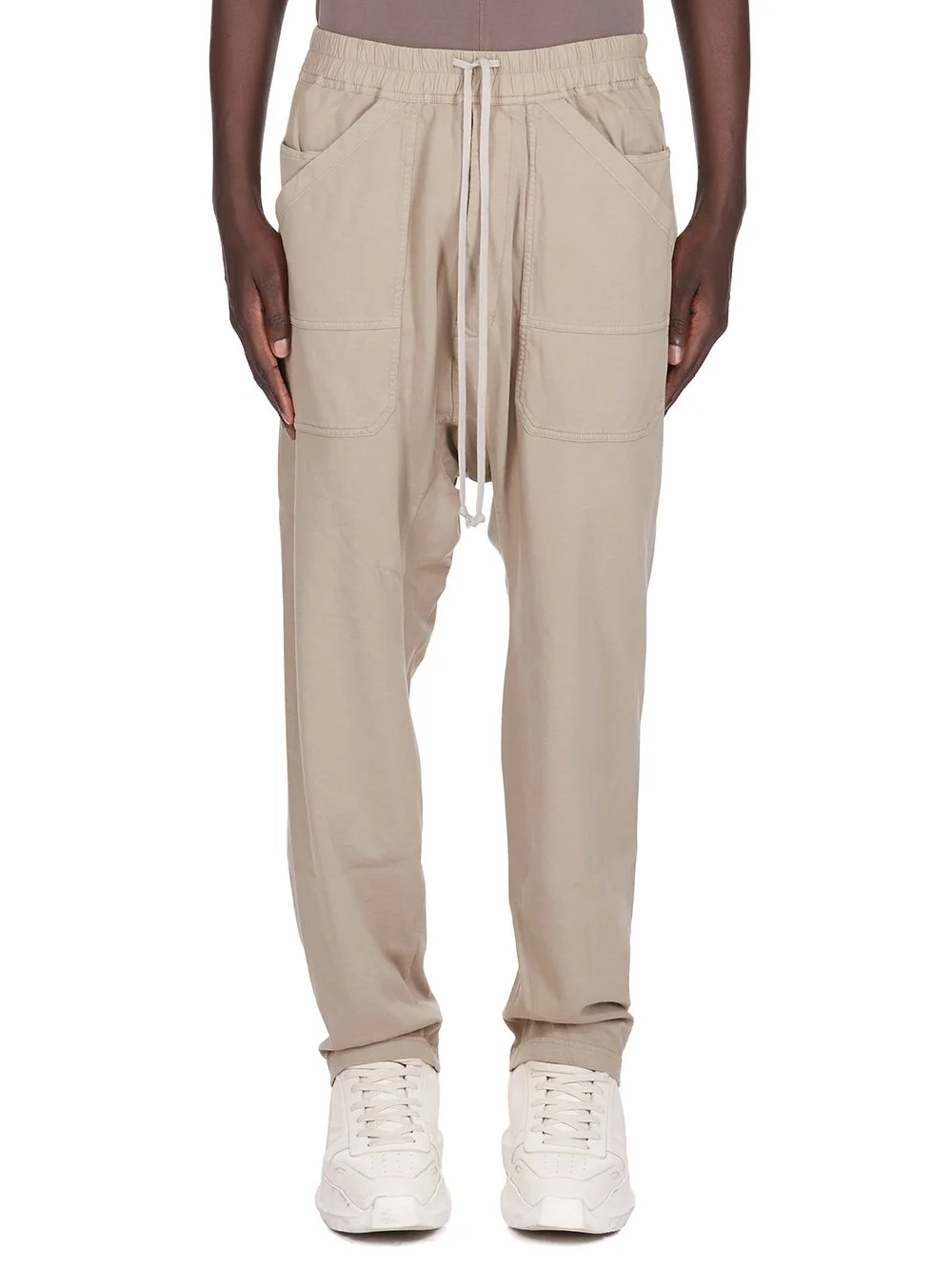 DRKSHDW FW25 CONCORDIANS CLASSIC CARGO DRAWSTRING IN DIRTY PEARL COMPACT HEAVY JERSEY THESE CLASSIC CARGO DRAWSTRING PANTS ARE FULL LENGTH. THEY HAVE AN ELASTICIZED WAISTBAND WITH DRAWSTRING AND STITCHED FLY. THEY FEATURE TWO ANGULAR SIDE FRONT PATCH POCKETS AND TWO BACK SQUARE PATCH POCKETS WITH FLAPS. THIS HEAVYWEIGHT AND COMPACT COTTON JERSEY HAS A BRUSHED AND SOFT HANDFEEL. THIS JERSEY IS GARMENT DYED THIS FABRIC IS MADE USING GOTS CERTIFIED ORGANIC COTTON WHICH MEANS THE NATURAL FIBER IS GROWN WITHOUT HARMFUL CHEMICALS, LEAVING OUR SOIL, AIR AND WATER CLEANER FROM CONTAMINATES COLOR: DIRTY PEARL MATERIAL:100% COTTON MODEL IS 189CM TALL MODEL WEARS SIZE S