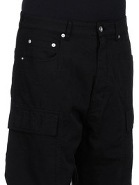 DRKSHDW FW25 CONCORDIANS DOUBLE CARGO JEANS IN BLACK COTTON TWILL THESE DOUBLE CARGO JEANS ARE A FULL LENGTH 5-POCKET JEAN WITH A LOW-RISE AND A LOOSE FIT. THEY HAVE A CONCEALED SILVER ZIPPER FLY WITH TOP BUTTON, BELT LOOPS AND POCKET RIVETS AND THEY FEATURE TWO BEVELED CARGO POCKETS ON THE THIGH, WITH TWO SQUARE CARGO POCKETS BELOW AND TWO SQUARE BACK POCKETS. THEY ALL HAVE FLAPS AND TOPSTITCHING. THIS MEDIUMWEIGHT WORKWEAR COTTON TWILL IS GARMENT DYED WITH A SOFT AND WASHED HANDFEEL THIS FABRIC IS MADE USING GOTS CERTIFIED ORGANIC COTTON WHICH MEANS THE NATURAL FIBER IS GROWN WITHOUT HARMFUL CHEMICALS, LEAVING OUR SOIL, AIR AND WATER CLEANER FROM CONTAMINATES COLOR: BLACK MATERIAL: 100% COTTON MODEL IS 189CM TALL MODEL WEARS SIZE 31