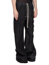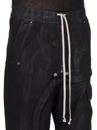 DRKSHDW SS25 HOLLYWOOD IMBALANCED DOUBLE CARGO JUMBO BELAS IN BLACK 13OZ FOIL DENIM THESE DOUBLE CARGO JUMBO BELA PANTS ARE FULL-LENGTH WITH A LOW CROTCH AND WIDE LEG. THEY FEATURE AN ELASTICIZED WAISTBAND WITH DRAWSTRING AND A BELA EXPOSED CENTER ZIPPER WITH TWO SNAP DETAIL, AND SIDE WELT POCKETS WITH RIVETS. THEY FEATURE TWO BEVELED CARGO POCKETS ON THE THIGH, WITH TWO SQUARE CARGO POCKETS BELOW, AND TWO SQUARE BACK POCKETS, ALL HAVE FLAPS AND TOPSTITCHING THIS MEDIUMWEIGHT FOIL DENIM IS OVERDYED AND HAS A CLEAR, SEMI SHINY FOIL OVERLAY THAT CREATES A WAXY TOUCH. SINCE THE FOIL IS PRESSED ON TOP OF THE FINAL GARMENTS, EACH PIECE WILL HAVE ITS OWN UNIQUE LOOK AND CREASES SINCE THE FOIL WILL ATTACH TO DIFFERENT PLACES DEPENDING ON THE GARMENT THIS FABRIC IS MADE USING GOTS CERTIFIED ORGANIC COTTON WHICH MEANS THE NATURAL FIBER IS GROWN WITHOUT HARMFUL CHEMICALS, LEAVING OUR SOIL, AIR AND WATER CLEANER FROM CONTAMINATES THIS GARMENT IS TREATED IN AN ITALIAN WASH HOUSE BASED IN THE VENETO AREA OF ITALY, THAT PRODUCES IN SMALLER TREATMENT BATHS TO REDUCE WATER WASTE AND UTILIZE A WATER PURIFYING PROCESS THAT ENABLES THEM TO RECYCLE A PORTION OF THE WATER USED. ALL OF OUR DENIM WASHES ARE ZDHC CERTIFIED COLOR: BLACK MATERIAL: 100% COTTON BAND 90% COTTON + 7% POLYESTER + 3% RUBBER POCKETS LINING 52% POLYESTER + 48% COTTON MODEL IS 189CM TALL MODEL WEARS SIZE S