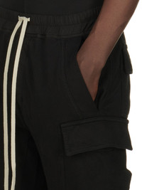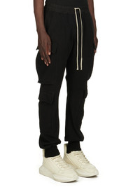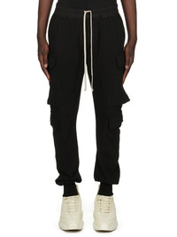 RICK OWENS FW24 PORTERVILLE MASTODON MEGACARGO IN BLACK COMPACT COTTON JERSEY THESE MASTODON MEGACARGO PANTS ARE FULL LENGTH WITH A SLIM FIT, AN ELASTICIZED WAISTBAND WITH DRAWSTRING AND ELASTICATED ANKLES. THEY FEATURE TWO SQUARE CARGO POCKETS ON THE THIGH, WITH TWO BEVELED CARGO POCKETS BELOW, AND TWO SQUARE BACK POCKETS, ALL HAVE FLAPS WITH SCRATCH FASTENINGS AND TOPSTITCHING THIS HEAVYWEIGHT AND COMPACT COTTON JERSEY HAS A BRUSHED AND SOFT HANDFEEL. THIS JERSEY IS GARMENT DYED. THIS FABRIC IS MADE USING GOTS CERTIFIED ORGANIC COTTON WHICH MEANS THE NATURAL FIBER IS GROWN WITHOUT HARMFUL CHEMICALS, LEAVING OUR SOIL, AIR AND WATER CLEANER FROM CONTAMINATES - COLOR: BLACK - MATERIAL: 100% COTTON - BAND 97% COTTON + 3% ELASTANE - MODEL IS 189CM TALL - MODEL WEARS SIZE S