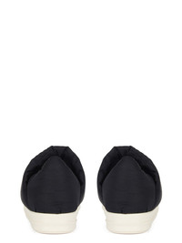 DRKSHDW FW24 PORTERVILLE PUFFER SLIP ON IN BLACK/MILK COTTON NYLON FAILLE THESE PUFFER SLIP ON ARE UNDER-ANKLE HEIGHT. THEY HAVE A SOFT PADDED PULL ON UPPER WITH QUILTING LINES, AND SHARK TOOTH SOLES THIS COTTON NYLON BLEND HAS A MICRO FAILLE STRUCTURE AND A SOFT HANDFEEL. THIS PRODUCT WAS MADE USING CERTIFIED RECYCLED POLYAMIDE BECAUSE IS ENSURES A REDUCTION IN WATER CONSUMPTION, EMISSIONS AND HAZARDOUS WASTE, LESSENING THE DEPENDENCE ON NON-RENEWABLE RESOURCES THIS FABRIC WAS ALSO MADE USING GOTS CERTIFIED ORGANIC COTTON WHICH MEANS THE NATURAL FIBER IS GROWN WITHOUT HARMFUL CHEMICALS, LEAVING OUR SOIL, AIR AND WATER CLEANER FROM CONTAMINATES - COLOR: BLACK/MILK - MATERIAL: UPPER 53% NYLON + 47% COTTON - LINING 100% NYLON - PADDING 100% POLYESTER - INSOLE 60% POLYURETHANE + 40% POLYESTER - SOLE 100% THERMOPLASTIC RUBBER