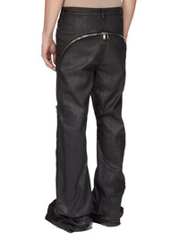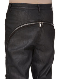 DRKSHDW FW25 CONCORDIANS BOLAN BANANA IN BLACK WAX BLACK WAX STRETCH DENIM THIS BOLAN BANANA IS A HIGH WAISTED, SLIM FIT 6-POCKET JEAN WITH A FLOOR-LENGTH BOOT CUT. THEY HAVE A WAISTBAND WITH BELT LOOPS AND POCKET RIVETS AND CLOSE WITH A CONCEALED BUTTON FLY. THEY FEATURE A LONG ZIPPER RUNNING FROM CENTRE BUTT, CURVING AROUND THE HIP TO THE HEM. IT CAN UNZIPPER AT BACK TO EXPOSE THE BUTT AND ALSO UP FROM THE HEM TO EXPOSE AN INNER, FLARED PANEL IN THE LEG. THIS LIGHTWEIGHT BLACK WAX DENIM IS MADE ON A 10OZ BLACK AND NATURAL STRETCH DENIM. THE READY GARMENT IS OVERDYED BLACK AND TREATED WITH A WAX FINISH. A FINAL WASH GIVES THIS GARMENT ITS SOFTNESS THIS GARMENT IS TREATED IN AN ITALIAN WASH HOUSE BASED IN THE VENETO AREA OF ITALY, THAT PRODUCES IN SMALLER TREATMENT BATHS TO REDUCE WATER WASTE AND UTILIZE A WATER PURIFYING PROCESS THAT ENABLES THEM TO RECYCLE A PORTION OF THE WATER USED. ALL OF OUR DENIM WASHES ARE ZDHC CERTIFIED COLOR: BLACK WAX MATERIAL: 91% COTTON + 6% ELASTOMULTIESTER + 3% RUBBER FIBER POCKETS LINING 100% COTTON MODEL IS 189CM TALL MODEL WEARS SIZE 31