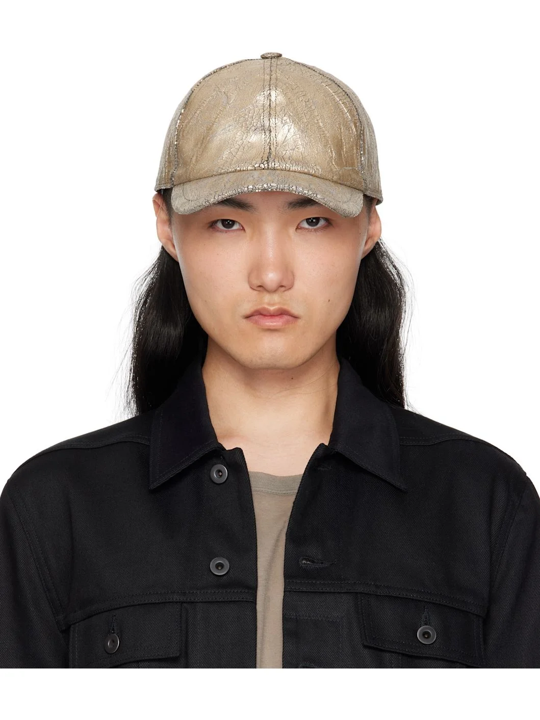 Overdyed and cracked stretch denim cap. · Curved brim · Snapback fastening · Plain-woven cotton browband Supplier color: Gold Body: 91% cotton, 6% elastane, 3% rubber. Lining: 100% cotton. Made in Italy 251126M139006