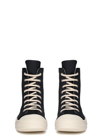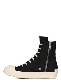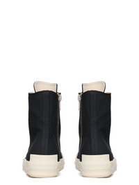 DRKSHDW SS25 HOLLYWOOD SNEAKS IN BLACK/MILK/MILK 13OZ OVERDYED DENIM THESE SNEAKS ARE ABOVE ANKLE HEIGHT AND FEATURE EIGHT EYELETS, LACES, A ZIPPER ON THE INSIDE ANKLE FOR EASY FASTENING, TOE CAPS AND SHARK-TOOTH SOLES THIS MEDIUMWEIGHT 13OZ DENIM IS OVERDYED AND HAS A SOFT AND WASHED HANDFEEL. THIS FABRIC IS MADE USING GOTS CERTIFIED ORGANIC COTTON WHICH MEANS THE NATURAL FIBER IS GROWN WITHOUT HARMFUL CHEMICALS, LEAVing OUR SOIL, AIR AND WATER CLEANER FROM CONTAMINATES COLOR: BLACK/MILK/MILK MATERIAL: UPPER 100% COTTON TOE 70% POLYURETHANE + 30% VISCOSE LINING 100% COTTON SOLE 100% THERMOPLASTIC RUBBER SOLE HEIGHT 3.5CM