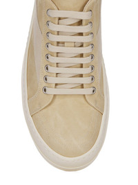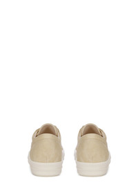 DRKSHDW SS25 HOLLYWOOD VINTAGE SNEAKS IN PARCHMENT/MILK/MILK COTTON CANVAS AND VELOUR SUEDE THESE VINTAGE SNEAKS ARE UNDER-ANKLE HEIGHT AND HAVE EIGHT EYELETS WITH LACES, TOE CAPS AND SHARK TOOTH SOLES. THEY FEATURE A GRAPHIC LEATHER APPLIQUE ON THE SIDE FOOT AND CONTRAST STITCHING THIS IS A COMBINATION OF COTTON CANVAS AND VELOUR SUEDE. THIS MEDIUMWEIGHT COTTON CANVAS IS COMPACT WITH A SOFT HANDFEEL. THIS GARMENT HAS BEEN GARMENT DYED. THIS FABRIC IS MADE USING GOTS CERTIFIED ORGANIC COTTON WHICH MEANS THE NATURAL FIBER IS GROWN WITHOUT HARMFUL CHEMICALS, LEAVING OUR SOIL, AIR AND WATER CLEANER FROM CONTAMINATES COLOR: PARCHMENT/MILK/MILK MATERIAL: UPPER 100% COTTON LATERAL DETAILS 100% CALF LEATHER LINING 100% COTTON SOLE 100% THERMOPLASTIC RUBBER SOLE HEIGHT 3.5CM
