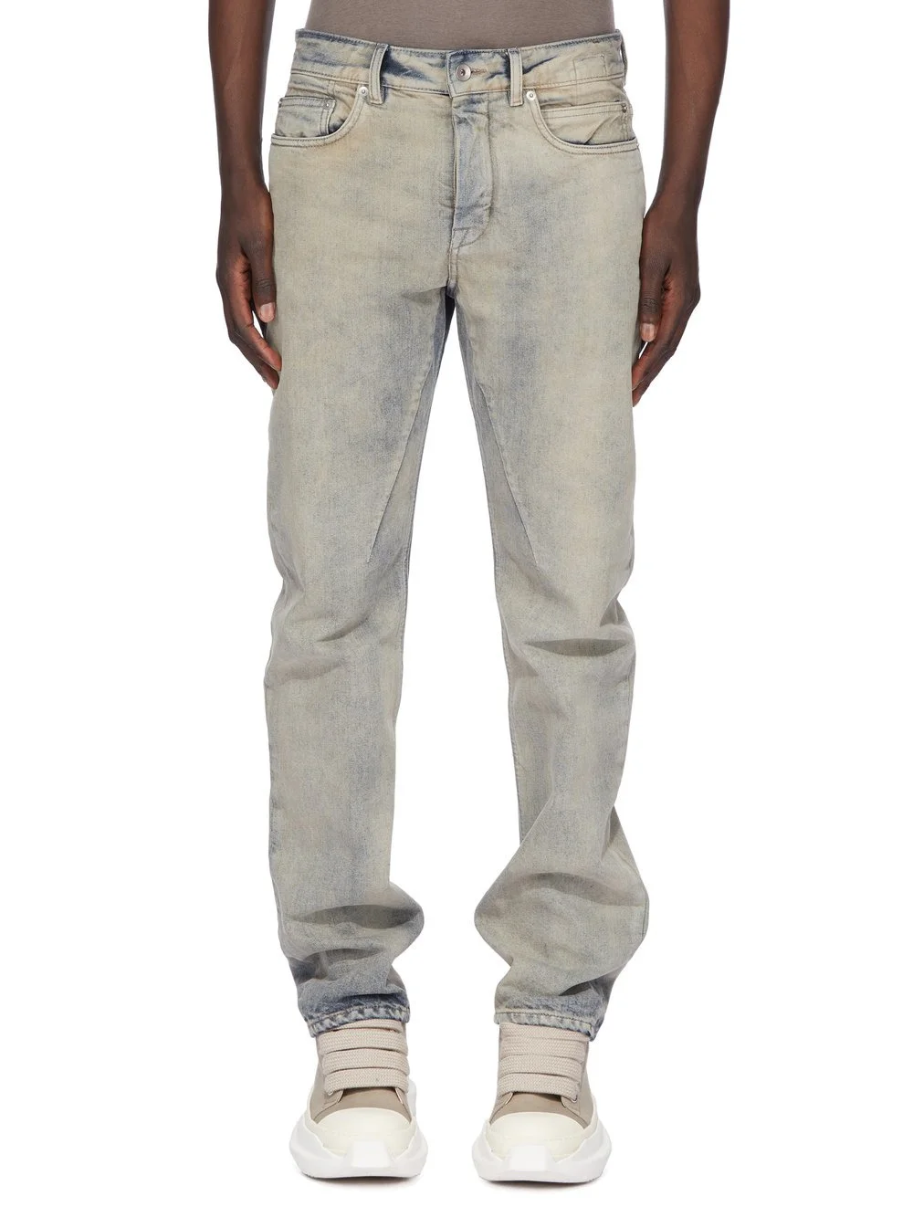 DRKSHDW FW25 CONCORDIANS FOG CUT IN 13OZ MINERAL PEARL DENIM THESE FOG CUT ARE AN ABOVE ANKLE LENGTH, 6-POCKET JEAN WITH A LOW RISE AND REGULAR FIT. THEY HAVE A CONCEALED SILVER ZIPPER FLY WITH TOP BUTTON. THEY FEATURE CROTCH AND KNEE WHISKERING. THIS MEDIUMWEIGHT MINERAL PEARL DENIM IS MADE ON A 13OZ INDIGO AND NATURAL DENIM. THE READY GARMENT IS STONE WASHED TOGETHER WITH A MINERAL DYE THIS GARMENT IS TREATED IN AN ITALIAN WASH HOUSE BASED IN THE VENETO AREA OF ITALY, THAT PRODUCES IN SMALLER TREATMENT BATHS TO REDUCE WATER WASTE AND UTILIZE A WATER PURIFYING PROCESS THAT ENABLES THEM TO RECYCLE A PORTION OF THE WATER USED. ALL OF OUR DENIM WASHES ARE ZDHC CERTIFIED COLOR: MINERAL PEARL MATERIAL: 100% COTTON POCKETS LINING 52% POLYESTER + 48% COTTONMODEL IS 189CM TALL MODEL WEARS SIZE 31