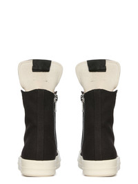 DRKSHDW SS25 HOLLYWOOD SNEAKS IN BLACK/MILK/MILK 13OZ OVERDYED DENIM THESE SNEAKS ARE ABOVE ANKLE HEIGHT AND FEATURE EIGHT EYELETS, LACES, A ZIPPER ON THE INSIDE ANKLE FOR EASY FASTENING, TOE CAPS AND SHARK-TOOTH SOLES THIS MEDIUMWEIGHT 13OZ DENIM IS OVERDYED AND HAS A SOFT AND WASHED HANDFEEL. THIS FABRIC IS MADE USING GOTS CERTIFIED ORGANIC COTTON WHICH MEANS THE NATURAL FIBER IS GROWN WITHOUT HARMFUL CHEMICALS, LEAVing OUR SOIL, AIR AND WATER CLEANER FROM CONTAMINATES COLOR: BLACK/MILK/MILK MATERIAL: UPPER 100% COTTON TOE 70% POLYURETHANE + 30% VISCOSE LINING 100% COTTON SOLE 100% THERMOPLASTIC RUBBER SOLE HEIGHT 3.5CM