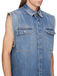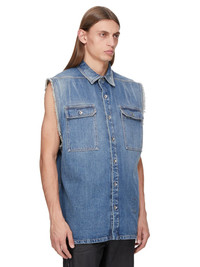DRKSHDW SS25 HOLLYWOOD SL TOMMY JUMBO OUTERSHIRT IN WASHED INDIGO 13OZ DENIM THIS SL TOMMY JUMBO OUTERSHIRT IS BELOW-HIP LENGTH WITH A JUMBO, BOXY FIT AND RAW CUT ARM HOLES. IT HAS A CENTRE FRONT OPENING WITH SNAPS, A COLLAR, A HEM WITH BEVELED SIDE SEAMS AND SNAP CUFFS. IT FEATURES TWO SQUARE POCKETS ON THE CHEST WITH FLAPS AND BEVELED CORNERS, THE SIGNATURE LEVEL SHOULDER SEAMS AND A COTTON WEBBING STRAP WITH RIVET DETAIL ON THE BACK YOKE. IT HAS TWO INTERNAL POCKETS THIS MEDIUMWEIGHT WASHED INDIGO DENIM IS MADE ON A 13OZ INDIGO AND NATURAL JAPANESE SELVEDGE DENIM. THE READY GARMENT IS WASHED WITH MINERALS TO ACHIEVE THE FINAL LOOK. THIS GARMENT IS TREATED IN AN ITALIAN WASH HOUSE BASED IN THE VENETO AREA OF ITALY, THAT PRODUCES IN SMALLER TREATMENT BATHS TO REDUCE WATER WASTE AND UTILIZE A WATER PURIFYING PROCESS THAT ENABLES THEM TO RECYCLE A PORTION OF THE WATER USED. ALL OF OUR DENIM WASHES ARE ZDHC CERTIFIED COLOR: WASHED INDIGO MATERIAL: 100% COTTON MODEL IS 189CM TALL MODEL WEARS SIZE S