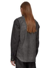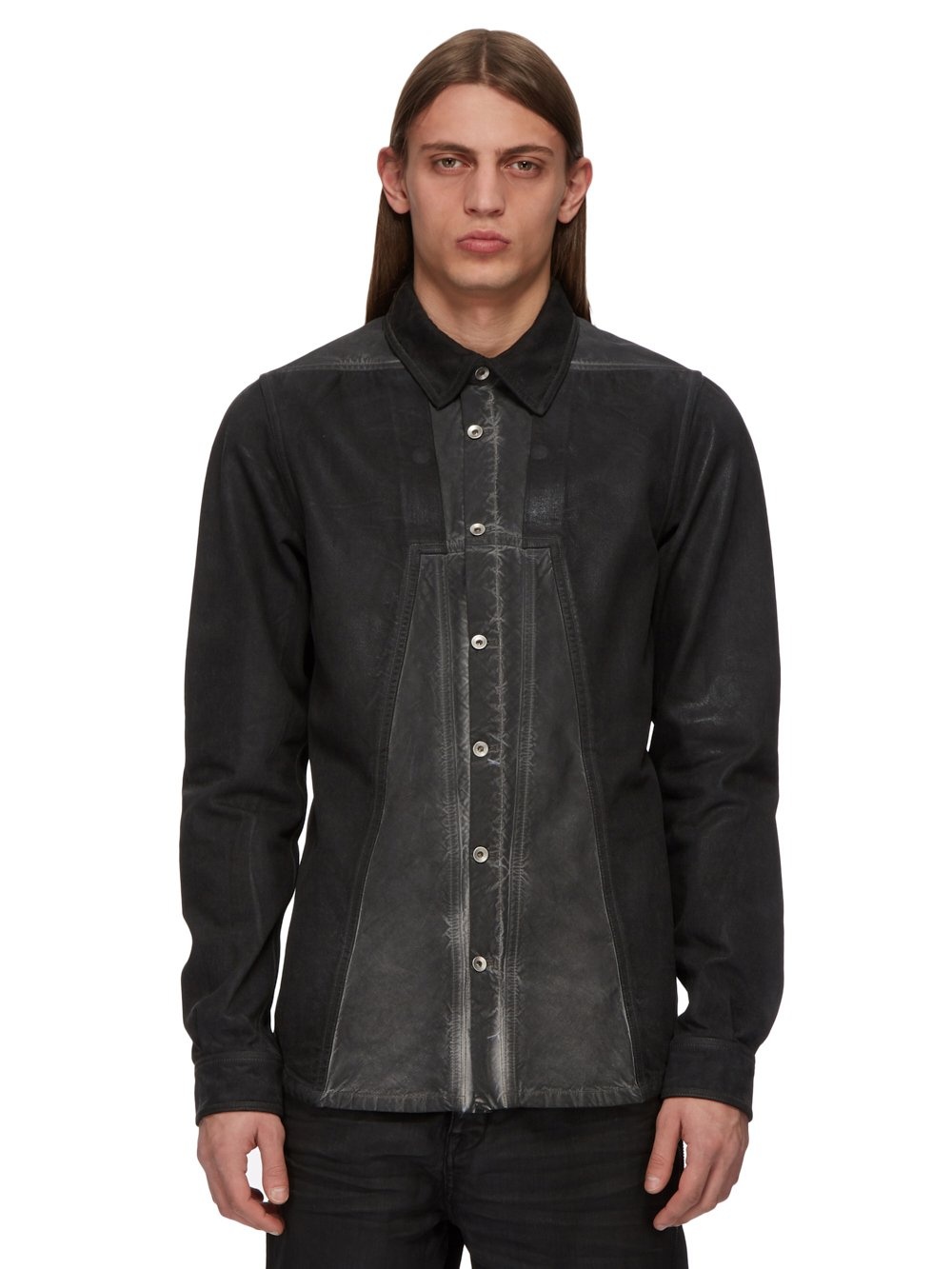 RICK OWENS FW24 PORTERVILLE SPLINTERED SHIRT IN STONE 13OZ SLIVER WASH THIS SPLINTERED SHIRT IS HIP-LENGTH WITH A STRAIGHT FIT. IT HAS A CENTRE FRONT PLACKET WITH METAL BUTTONS, A CLASSIC COLLAR AND A HEMLINE WITH BEVELED SIDES SEAMS. IT HAS LONG SLEEVES WITH BUTTONED CUFFS, SIGNATURE LEVEL SHOULDER SEAMS, A BACK YOKE AND DOUBLE TOP STITCHING ON ALL SEAMS. IT FEATURES THE SPLINTERED MOTIVO, WITH SEAM LINES DESCENDING FROM THE NECK TO A BLUNT POINT AT THE WAIST, AND ACROSS THE CHEST, SLOPING DOWN THE SIDE BODY WRAPPING TO THE HEM THIS MEDIUMWEIGHT SLIVER WASH DENIM IS MADE FROM A COMBINATION OF A 13OZ BLACK AND NATURAL JAPANESE DENIM AND A LIGHT COTTON CANVAS. THE GARMENT IS STONE WASHED AND THEN OVER SPRAYED WITH A FADED TECHNIQUE. A CLEAR FOIL OVERLAY CREATES THE FINAL LOOK AND WAXY TOUCH. SINCE THE FOIL IS PRESSED ON TOP OF THE FINAL GARMENTS, EACH PIECE WILL HAVE ITS OWN UNIQUE LOOK AND CREASES SINCE THE FOIL WILL ATTACH TO DIFFERENT PLACES DEPENDING ON THE GARMENT. THIS GARMENT IS TREATED IN AN ITALIAN WASH HOUSE BASED IN THE VENETO AREA OF ITALY, THAT PRODUCES IN SMALLER TREATMENT BATHS TO REDUCE WATER WASTE AND UTILIZE A WATER PURIFYING PROCESS THAT ENABLES THEM TO RECYCLE A PORTION OF THE WATER USED. ALL OF OUR DENIM WASHES ARE ZDHC CERTIFIED - COLOR: STONE - MATERIAL: FRONT + SLEEVES + NECK 100% COTTON - BACK + FRONT DETAIL 100% COTTON - POCKETS LINING 52% POLYESTER + 48% COTTON - MODEL IS 189CM TALL - MODEL WEARS SIZE S