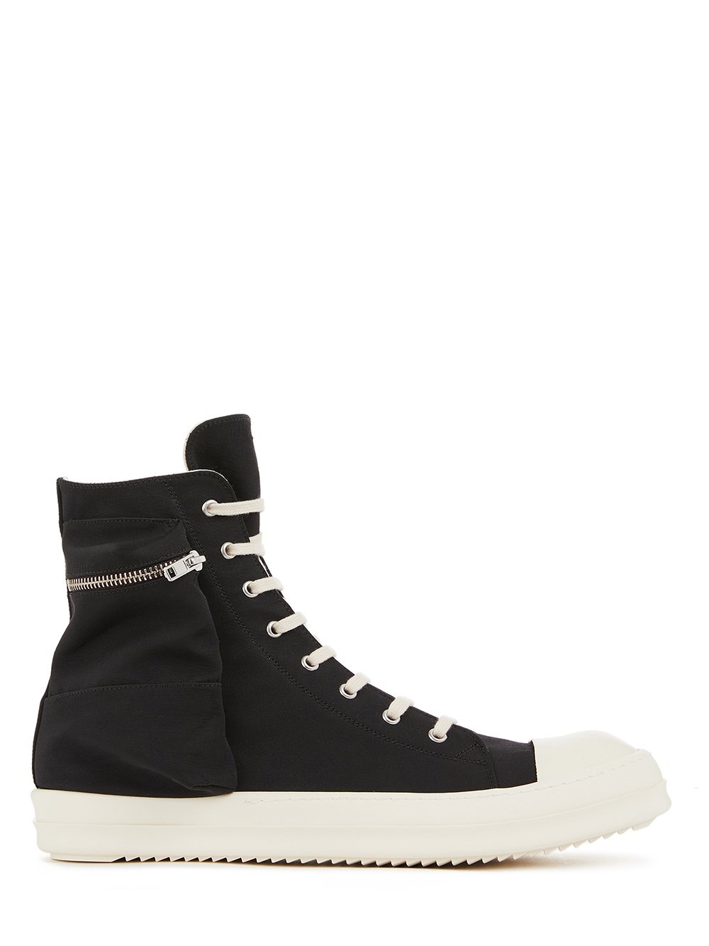 DRKSHDW SS22 FOGACHINE CARGO SNEAKERS IN COTTON NYLON FAILLE THESE CARGO SNEAKERS ARE ABOVE ANKLE HEIGHT AND FEATURE EIGHT EYELETS, LACES, A SIDE ZIPPER FOR EASY FASTENING, A ZIPPED CARGO POCKET ON THE OUTER ANKLE, TOE CAPS AND SHARK-TOOTH SOLES - MATERIAL:UPPER: 53% NYLON + 47% COTTON - TOE: 100% CALF LEATHER - LINING: 100% COTTON - SOLE: 100% THERMOPLASTIC POLYURETHANE