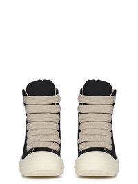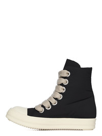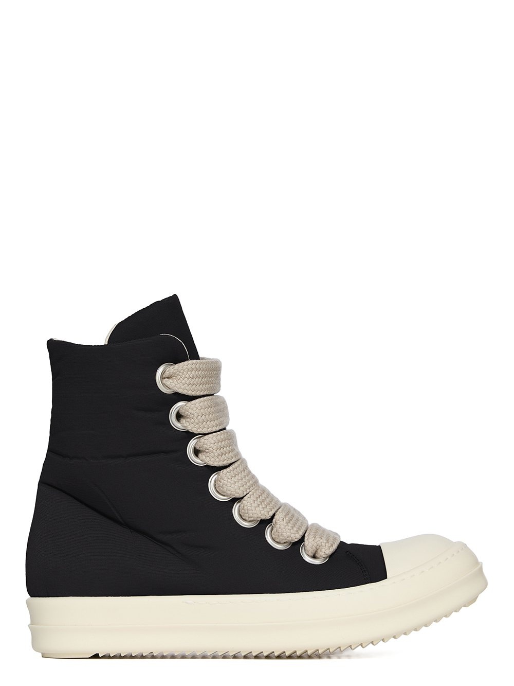 DRKSHDW SS25 HOLLYWOOD JUMBO LACE PUFFER SNEAKS IN BLACK/MILK/MILK COTTON NYLON FAILLE THESE JUMBO LACE PUFFER SNEAKS ARE ABOVE ANKLE HEIGHT. THEY ARE A BLOWN UP VERSION OF OUR SIGNATURE SNEAKER, WITH A CUSHIONED OUTER AND JUMBO LACES. THEY HAVE SEVEN LARGE EYELETS, TOE CAPS AND SHARK-TOOTH SOLES THIS MEDIUMWEIGHT COTTON AND NYLON BLEND HAS A MICRO FAILLE STRUCTURE AND A SOFT TECHNICAL HANDFEEL THIS PRODUCT WAS MADE USING CERTIFIED RECYCLED POLYAMIDE BECAUSE IT ENSURES A REDUCTION IN WATER CONSUMPTION, EMISSIONS AND HAZARDOUS WASTE, LESSENING THE DEPENDENCE ON NON-RENEWABLE RESOURCES THIS FABRIC WAS ALSO MADE USING GOTS CERTIFIED ORGANIC COTTON WHICH MEANS THE NATURAL FIBER IS GROWN WITHOUT HARMFUL CHEMICALS, LEAVING OUR SOIL, AIR AND WATER CLEANER FROM CONTAMINATES COLOR: BLACK/MILK/MILK MATERIAL: UPPER 53% NYLON + 47% COTTON TOE 70% POLYURETHANE + 30% VISCOSE LINING 100% COTTON PADDING 100% POLYESTER SOLE 100% THERMOPLASTIC RUBBER SOLE HEIGHT 3.5CM