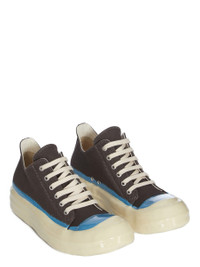DRKSHDW FW25 CONCORDIANS LOW SNEAKS IN DARK DUST/BLUE/LIGHT BEIGE 13OZ OVERDYED DENIM THESE LOW SNEAKS ARE UNDER-ANKLE HEIGHT AND FEATURE SIX EYELETS, LACES, TOE CAPS AND SHARK TOOTH SOLES. THIS MEDIUMWEIGHT 13OZ DENIM IS OVERDYED AND HAS A SOFT AND WASHED HANDFEEL. THIS FABRIC IS MADE USING GOTS CERTIFIED ORGANIC COTTON WHICH MEANS THE NATURAL FIBER IS GROWN WITHOUT HARMFUL CHEMICALS, LEAVING OUR SOIL, AIR AND WATER CLEANER FROM CONTAMINATES. THESE SHOES HAVE BEEN TREATED WITH A RESISTANT SILICONE. THE SHOES ARE DIPPED BY HAND AND LEFT TO DRY MULTIPLE TIMES IN ORDER TO ACHIEVE THE MULTICOLORED EFFECT. COLOR: DARK DUST/BLUE/LIGHT BEIGE MATERIAL: UPPER 100% COTTON TOE 70% POLYURETHANE + 30% VISCOSE LINING 100% COTTON SOLE HEIGHT 3.5CM