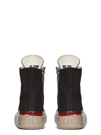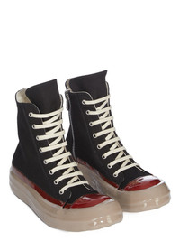 DRKSHDW FW25 CONCORDIANS SNEAKS IN BLACK/RED/DRK BEIGE 13OZ OVERDYED DENIM THESE SNEAKS ARE ABOVE ANKLE HEIGHT AND FEATURE EIGHT EYELETS, LACES, A ZIPPER ON THE INSIDE ANKLE FOR EASY FASTENING, TOE CAPS AND SHARK TOOTH SOLES. THIS MEDIUMWEIGHT 13OZ DENIM IS OVERDYED AND HAS A SOFT AND WASHED HANDFEEL THIS FABRIC IS MADE USING GOTS CERTIFIED ORGANIC COTTON WHICH MEANS THE NATURAL FIBER IS GROWN WITHOUT HARMFUL CHEMICALS, LEAVING OUR SOIL, AIR AND WATER CLEANER FROM CONTAMINATES THESE SHOES HAVE BEEN TREATED WITH A RESISTANT SILICONE. THE SHOES ARE DIPPED BY HAND AND LEFT TO TRY MULTIPLE TIMES IN ORDER TO ACHIEVE THE MULTICOLORED EFFECT COLOR: BLACK/RED/DRK BEIGE MATERIAL: UPPER 100% COTTON TOE 70% POLYURETHANE + 30% VISCOSE LINING 100% COTTON SOLE HEIGHT 3.5CM