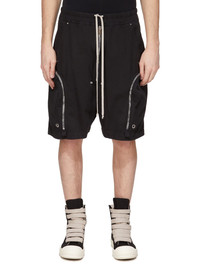 DRKSHDW FW25 CONCORDIANS BAUHAUS SHORTS IN BLACK COTTON TWILL THESE BAUHAUS SHORTS ARE KNEE-LENGTH WITH A LOW DROPPED CROTCH. THEY HAVE AN ELASTICIZED WAISTBAND WITH DRAWSTRING AND SIDE POCKETS. THEY FEATURE SIGNATURE ROUND BAUHAUS POCKETS WITH ZIPPERS, WEBBING TAB AND EYELET DETAIL ON THE FRONT THIGH. THEY HAVE BACK FLAP POCKETS WITH SNAPS. THIS MEDIUMWEIGHT WORKWEAR COTTON TWILL IS GARMENT DYED WITH A SOFT AND WASHED HANDFEEL THIS FABRIC IS MADE USING GOTS CERTIFIED ORGANIC COTTON WHICH MEANS THE NATURAL FIBER IS GROWN WITHOUT HARMFUL CHEMICALS, LEAVING OUR SOIL, AIR AND WATER CLEANER FROM CONTAMINATES COLOR: BLACK MATERIAL: 100% COTTON MODEL IS 189CM TALL MODEL WEARS SIZE S