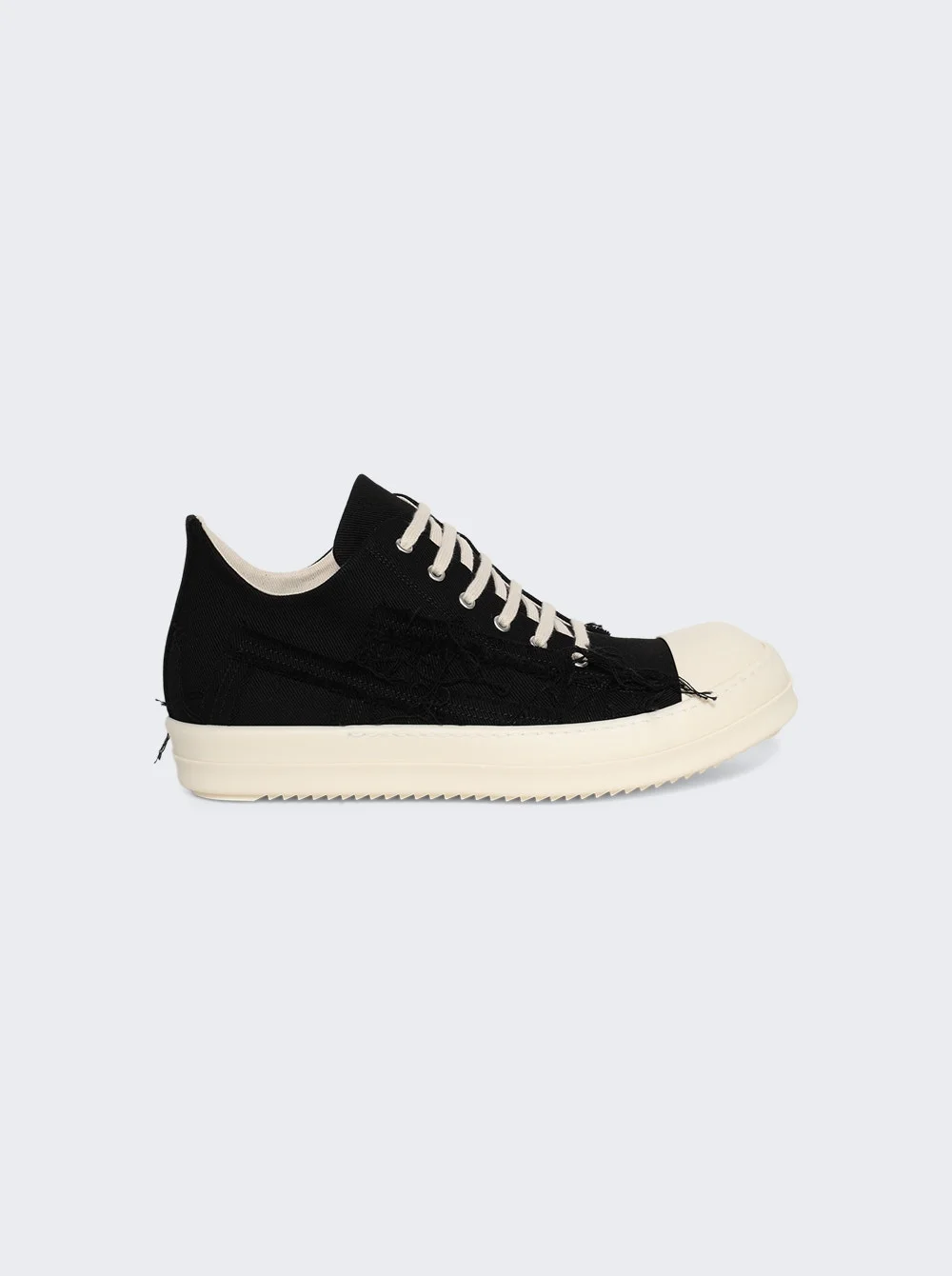 Details - Denim low-top sneakers with slashed and frayed detail - Shark-tooth bumper sole - Mediumweight 13oz overdyed denim with a soft and washed handfeel - Sole height: 3.5cm - Main Material: Cotton; Toe: 70% Polyurethane, 30% Viscose; Sole: Rubber Size Information: Vendor Color Code: Brand Style: DU01F4802 SLASH Designer/Brand: RICK OWENS DRKSHDW