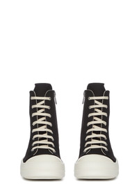 RICK OWENS FW24 PORTERVILLE SNEAKS IN BLACK/MILK/MILK 13OZ OVERDYED DENIM THESE SNEAKS ARE ABOVE ANKLE HEIGHT AND FEATURE EIGHT EYELETS, LACES, A ZIPPER ON THE INSIDE ANKLE FOR EASY FASTENING, TOE CAPS AND SHARK-TOOTH SOLES THIS MEDIUMWEIGHT 13OZ DENIM IS OVERDYED AND HAS A SOFT AND WASHED HANDFEEL. THIS FABRIC IS MADE USING GOTS CERTIFIED ORGANIC COTTON WHICH MEANS THE NATURAL FIBER IS GROWN WITHOUT HARMFUL CHEMICALS, LEAVING OUR SOIL, AIR AND WATER CLEANER FROM CONTAMINATES - COLOR: BLACK/MILK/MILK - MATERIAL: UPPER 100% COTTON - TOE 70% POLYURETHANE + 30% VISCOSE - LINING 100% COTTON - INSOLE 60% POLYURETHANE + 40% POLYESTER - SOLE 100% THERMOPLASTIC RUBBER