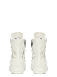 DRKSHDW SS26 TEMPLE SNEAKS IN MILK/MILK/MILK SLASHED 13OZ OVERDYED DENIM THESE SNEAKS ARE ABOVE ANKLE HEIGHT AND FEATURE EIGHT EYELETS, LACES, A ZIPPER ON THE INSIDE ANKLE FOR EASY FASTENING, TOE CAPS AND SHARK TOOTH SOLES. THIS MEDIUMWEIGHT 13OZ DENIM IS OVERDYED AND HAS A SOFT AND WASHED HANDFEEL. THIS FABRIC IS MADE USING GOTS CERTIFIED ORGANIC COTTON WHICH MEANS THE NATURAL FIBER IS GROWN WITHOUT HARMFUL CHEMICALS, LEAVING OUR SOIL, AIR AND WATER CLEANER FROM CONTAMINATES. THE SLASHED EFFECT IS MADE CUTTING THE FABRIC IN STRIPES AND SEWING THEM TOGETHER. COLOR: MILK/MILK/MILK MATERIAL:UPPER 100% COTTON TOE 70% POLYURETHANE + 30% VISCOSE LINING 100% COTTON SOLE 100% THERMOPLASTIC RUBBER SOLE HEIGHT 3.5CM