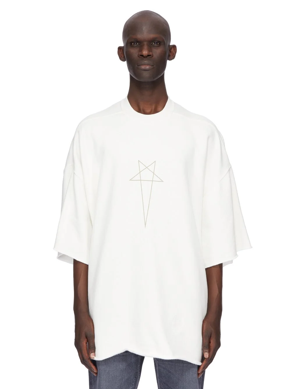 DRKSHDW FW25 CONCORDIANS TOMMY T IN MILK/PEARL FURKA HEAVY SWEATSHIRT THIS TOMMY T IS BELOW HIP LENGTH WITH A JUMBO OVERSIZED FIT. IT HAS WIDE, SHORT SLEEVES WITH A DROPPED ARMHOLE AND A RIBBED CREWNECK. IT FEATURES SIGNATURE FRONT LEVEL SHOULDER SEAMS AND A CENTRE BACK SEAM. THIS HEAVYWEIGHT COTTON SWEATSHIRT JERSEY HAS A SOFT AND WASHED HANDFEEL. THIS JERSEY IS GARMENT DYED THIS FABRIC IS MADE USING GOTS CERTIFIED ORGANIC COTTON WHICH MEANS THE NATURAL FIBER IS GROWN WITHOUT HARMFUL CHEMICALS, LEAVING OUR SOIL, AIR AND WATER CLEANER FROM CONTAMINATES COLOR: MILK/PEARL MATERIAL: 100% COTTON MODEL IS 189CM TALL ITEM IS AVAILABLE IN ONE SIZE