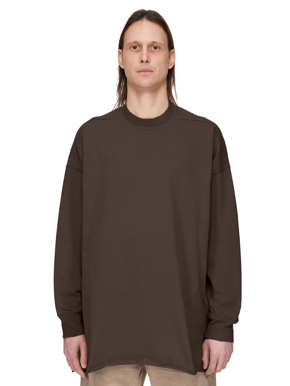 DRKSHDW FW25 CONCORDIANS TOMMY LS SWEAT IN IN DARKDUST COMPACT HEAVY JERSEY THIS TOMMY LS SWEAT IS BELOW HIP LENGTH WITH A JUMBO OVERSIZED FIT. IT FEATURES A LONG SLEEVE T-SHIRT WITH RIBBED CREWNECK, CUFFS AND A RAW CUT HEM. IT HAS THE SIGNATURE LEVEL SHOULDER SEAMS AND SINGLE SEAM RUNNING DOWN THE CENTRE BACK SPINE. THIS HEAVYWEIGHT AND COMPACT COTTON JERSEY HAS A BRUSHED AND SOFT HANDFEEL. THIS JERSEY IS GARMENT DYED THIS FABRIC IS MADE USING GOTS CERTIFIED ORGANIC COTTON WHICH MEANS THE NATURAL FIBER IS GROWN WITHOUT HARMFUL CHEMICALS, LEAVING OUR SOIL, AIR AND WATER CLEANER FROM CONTAMINATES COLOR: DARKDUST MATERIAL: 100% COTTON MODEL IS 189CM TALL MODEL WEARS SIZE S