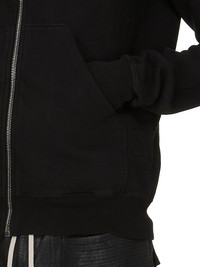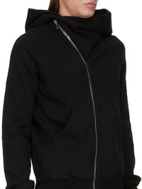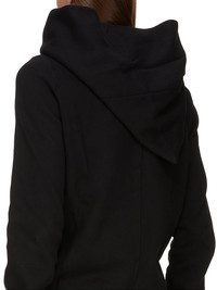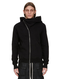 DRKSHDW SS25 HOLLYWOOD MOUNTAIN HOODIE IN BLACK FURKA HEAVY SWEATSHIRT THIS MOUNTAIN HOODIE IS ABOVE HIP LENGTH WITH LONG SLEEVES. IT HAS A CURVED ASYMMETRICAL ZIPPER CLOSURE, A SMALL FUNNEL NECK AND A LARGE POINTED HOOD. IT HAS TWO FRONT PATCH POCKETS, RIBBED CUFFS AND WAISTBAND SIGNATURE SINGLE SEAM RUNNING DOWN THE CENTRE BACK SPINE THIS HEAVYWEIGHT COTTON SWEATSHIRT JERSEY HAS A SOFT AND WASHED HANDFEEL. THIS JERSEY IS GARMENT DYED THIS FABRIC IS MADE USING GOTS CERTIFIED ORGANIC COTTON WHICH MEANS THE NATURAL FIBER IS GROWN WITHOUT HARMFUL CHEMICALS, LEAVING OUR SOIL, AIR AND WATER CLEANER FROM CONTAMINATES COLOR: BLACK MATERIAL: 100% COTTON MODEL IS 189CM TALL MODEL WEARS SIZE S