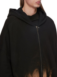 RICK OWENS FW24 PORTERVILLE JUMBO HOODED PETER IN BLACK/TERRA SUN FURKA SWEATSHIRT THIS JUMBO HOODED PETER JACKET IS BELOW HIP LENGTH AND AN OVERSIZED FIT. IT HAS A CENTRE FRONT OPENING WITH CONCEALED SNAPS, LONG SLEEVES WITH LOW SHOULDERS AND A DROPPED ARMHOLE, TWO LARGE SQUARE SIDE FRONT POCKETS, AND A HOODIT IS FULLY LINED AND HAS TWO INTERNAL ZIPPERED POCKETS THIS HEAVYWEIGHT COTTON SWEATSHIRT JERSEY HAS A SOFT AND WASHED HANDFEEL. IT IS GARMENT DYED BLACK AND WITH A TWO STEP TIE DYE AND DEGRADE PROCESS THE SUN MOTIF IS CREATED. THE ORANGE COLOR IS APPLIED BY SPRAY ALL OVER TO CREATE THE FINAL LOOK. THE NATURAL ASPECTS OF THIS TREATMENT MEANS THAT THE DEGRADE MOTIF AND COLORATION IS UNIQUE TO EACH GARMENT. THIS IS AN INHERENT CHARACTERISTIC OF THIS TYPE OF TREATMENT AND IS A DESIRED A VISUAL ASPECT. THIS FABRIC IS MADE USING GOTS CERTIFIED ORGANIC COTTON WHICH MEANS THE NATURAL FIBER IS GROWN WITHOUT HARMFUL CHEMICALS, LEAVING OUR SOIL, AIR AND WATER CLEANER FROM CONTAMINATES - COLOR: BLACK/TERRA - MATERIAL: 100% COTTON - MODEL IS 189CM TALL - MODEL WEARS SIZE S