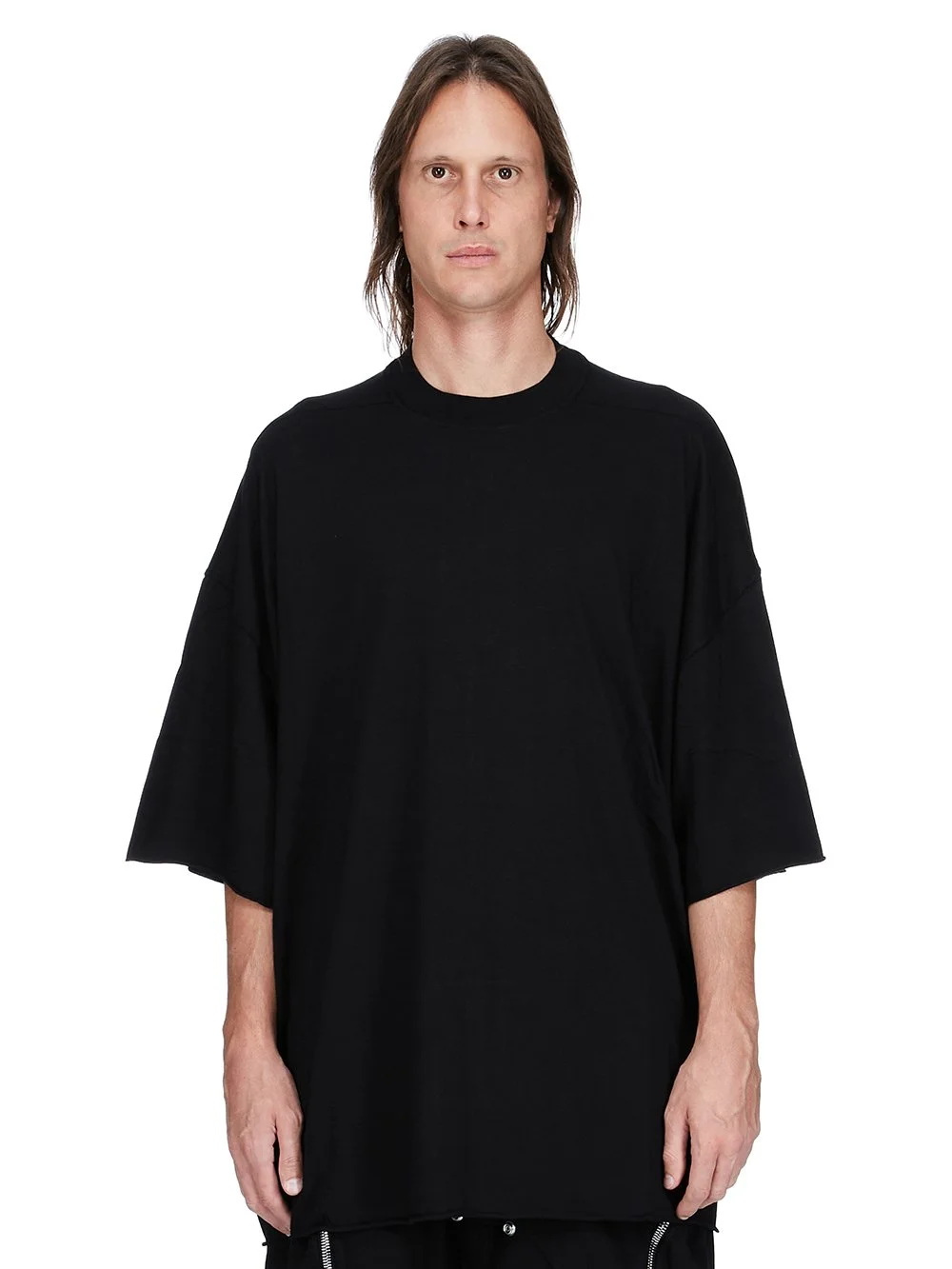 DRKSHDW FW25 CONCORDIANS TOMMY T IN BLACK MEDIUM WEIGHT COTTON JERSEY THIS TOMMY T IS BELOW HIP LENGTH WITH A JUMBO OVERSIZED FIT. IT HAS WIDE, SHORT SLEEVES WITH A DROPPED ARMHOLE AND A RIBBED CREWNECK. IT FEATURES SIGNATURE FRONT LEVEL SHOULDER SEAMS AND A CENTRE BACK SEAM. THIS MEDIUMWEIGHT COTTON JERSEY HAS A COMPACT AND DRY HANDFEEL. THIS JERSEY IS GARMENT DYED THIS FABRIC IS MADE USING GOTS CERTIFIED ORGANIC COTTON WHICH MEANS THE NATURAL FIBER IS GROWN WITHOUT HARMFUL CHEMICALS, LEAVING OUR SOIL, AIR AND WATER CLEANER FROM CONTAMINATES COLOR: BLACK MATERIAL: 100% COTTON MODEL IS 189CM TALL ITEM IS AVAILABLE IN ONE SIZE