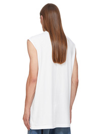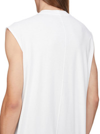 DRKSHDW SS25 HOLLYWOOD TARP T IN MILK MEDIUM WEIGHT COTTON JERSEY THIS TARP T IS BELOW HIP LENGTH, WITH A LOOSE FIT. IT IS SLEEVELESS WITH WIDE SHOULDERS AND A RIBBED CREW NECK. IT FEATURES SIGNATURE FRONT LEVEL SHOULDER SEAMS AND SINGLE SEAM RUNNING DOWN THE CENTRE BACK SPINE THIS MEDIUMWEIGHT COTTON JERSEY HAS A COMPACT AND DRY HANDFEEL. THIS JERSEY IS GARMENT DYED THIS FABRIC IS MADE USING GOTS CERTIFIED ORGANIC COTTON WHICH MEANS THE NATURAL FIBER IS GROWN WITHOUT HARMFUL CHEMICALS, LEAVING OUR SOIL, AIR AND WATER CLEANER FROM CONTAMINATES COLOR: MILK MATERIAL: 100% COTTON MODEL IS 189CM TALL MODEL WEARS SIZE S