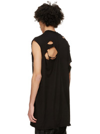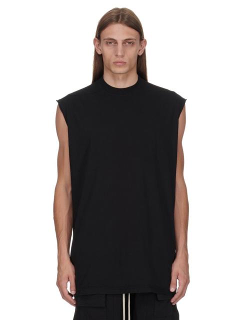 DRKSHDW SS25 HOLLYWOOD TARP T IN BLACK COTTON GAUZE JERSEY THIS TARP T IS BELOW HIP LENGTH, WITH A LOOSE FIT. IT IS SLEEVELESS WITH WIDE SHOULDERS AND A RIBBED CREW NECK. IT FEATURES SIGNATURE FRONT LEVEL SHOULDER SEAMS AND SINGLE SEAM RUNNING DOWN THE CENTRE BACK SPINE THIS LIGHTWEIGHT AND AIRY COTTON GAUZE JERSEY IS SEMI TRANSPARENT AND HAVE A SOFT WASHED HANDFEEL. THIS JERSEY IS GARMENT DYED THIS FABRIC IS MADE USING GOTS CERTIFIED ORGANIC COTTON WHICH MEANS THE NATURAL FIBER IS GROWN WITHOUT HARMFUL CHEMICALS, LEAVING OUR SOIL, AIR AND WATER CLEANER FROM CONTAMINATES COLOR: BLACK MATERIAL: 100% COTTON MODEL IS 189CM TALL MODEL WEARS SIZE S