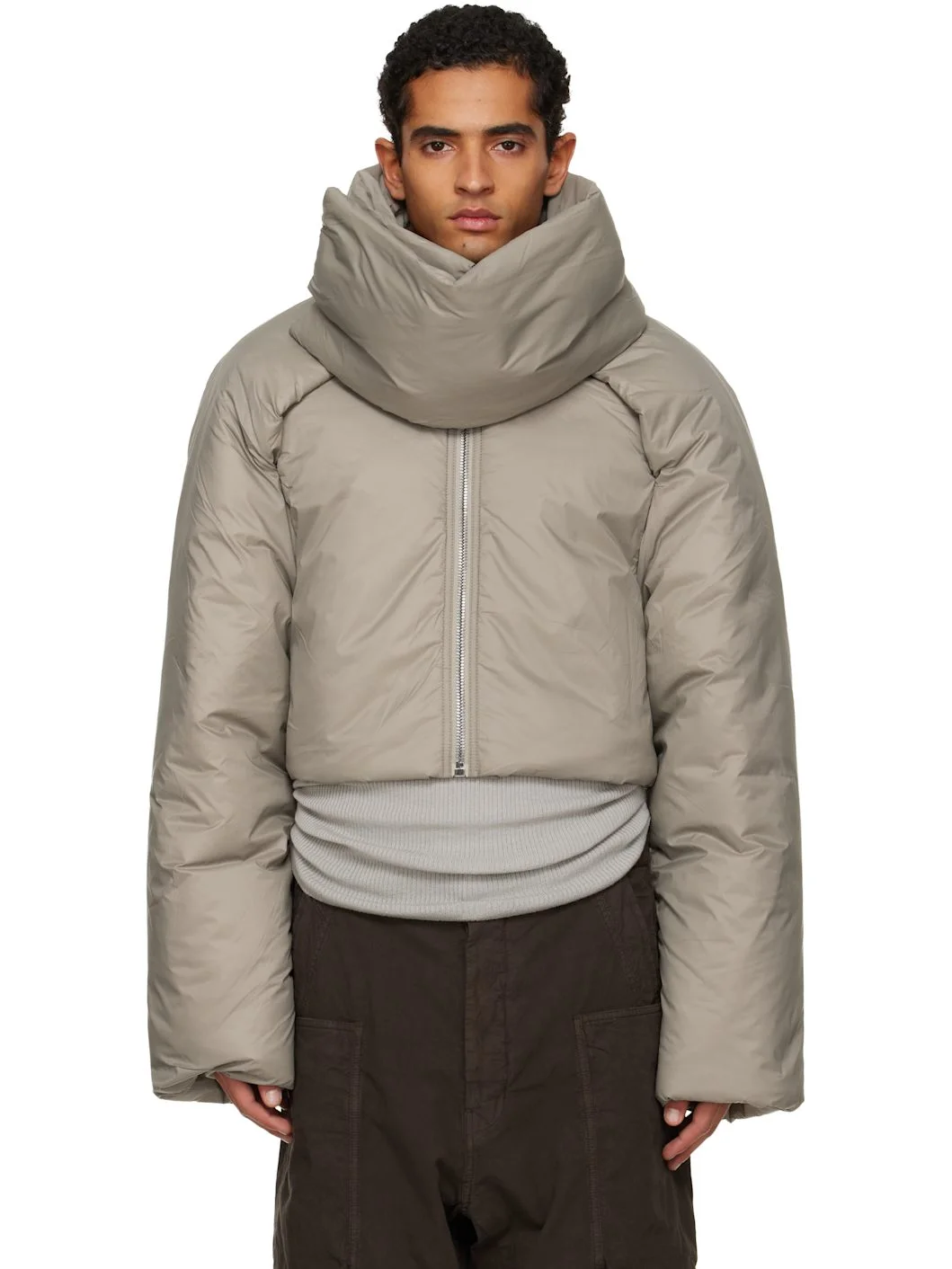 Padded and quilted recycled nylon satin jacket. · GRS-certified recycled nylon · Lightweight · Detachable throat guard at rib-knit stand collar · Zip closure · Cropped hem · Inset rib-knit cuffs · Foldover panel with press-stud fastening at shoulders · Webbing strap at back · Fully lined · Welt pockets and integrated logo-woven strap at interior Supplier color: Dirty pearl Body: 100% nylon. Fill: 100% polyester. Trim: 98% cotton, 2% elastane. Made in Moldova 252126M180000