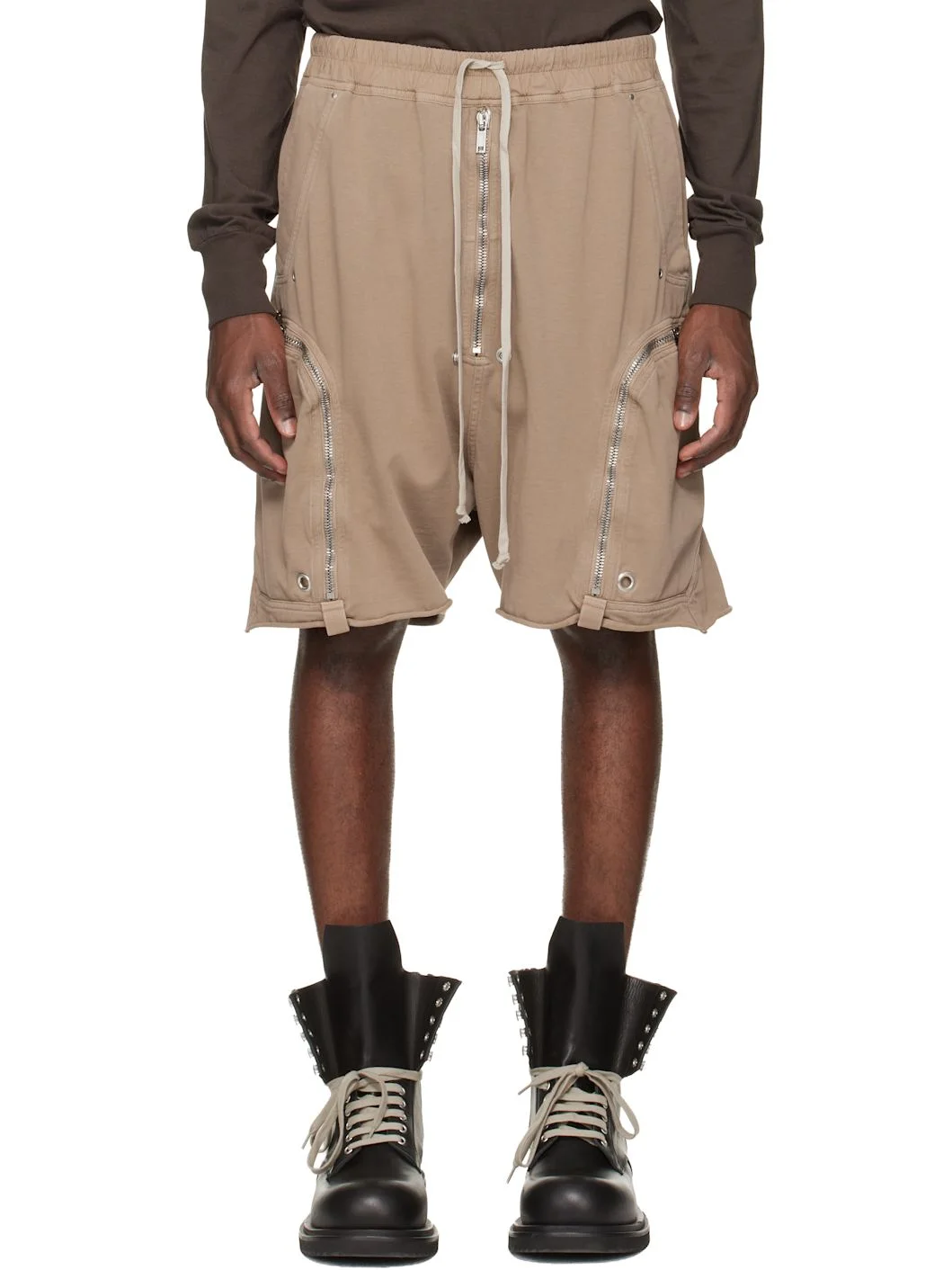Heavyweight GOTS-certified organic cotton jersey shorts. · Drawstring at elasticized taffeta waistband · Four-pocket styling · Exposed zip fly · Rivets, grommets, and press-stud hardware at front · Rolled edge at cuffs · Zip pocket with webbing trim at outseams · Dropped inseam Supplier color: Beige Body: 100% cotton. Trim: 97% cotton, 3% elastane. Made in Italy 261126M193019