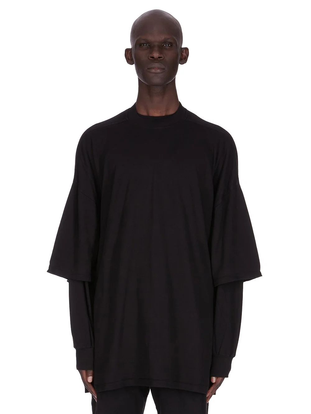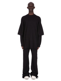 DRKSHDW FW25 CONCORDIANS TOMMY HUSTLER SWEAT IN BLACK DOUBLE BRUSHED JERSEY THIS TOMMY HUSTLER SWEAT IS BELOW HIP LENGTH WITH A JUMBO OVERSIZED FIT. IT FEATURES A LONG SLEEVE T-SHIRT WITH RIBBED CREWNECK, CUFFS AND A RAW CUT HEM, OVERLAID WITH A CROPPED OVERSIZE T-SHIRT WITH ELBOW LENGTH SLEEVES. IT HAS THE SIGNATURE LEVEL SHOULDER SEAMS AND SINGLE SEAM RUNNING DOWN THE CENTRE BACK SPINE. THIS MEDIUMWEIGHT COTTON JERSEY IS BRUSHED ON BOTH SIDES WHICH GIVES THE FABRIC A SOFT AND PEACHY HANDFEEL. THIS JERSEY IS GARMENT DYED THIS FABRIC IS MADE USING GOTS CERTIFIED ORGANIC COTTON WHICH MEANS THE NATURAL FIBER IS GROWN WITHOUT HARMFUL CHEMICALS, LEAVING OUR SOIL, AIR AND WATER CLEANER FROM CONTAMINATES COLOR: BLACK MATERIAL:100% COTTON MODEL IS 189CM TALL ITEM IS AVAILABLE IN ONE SIZE