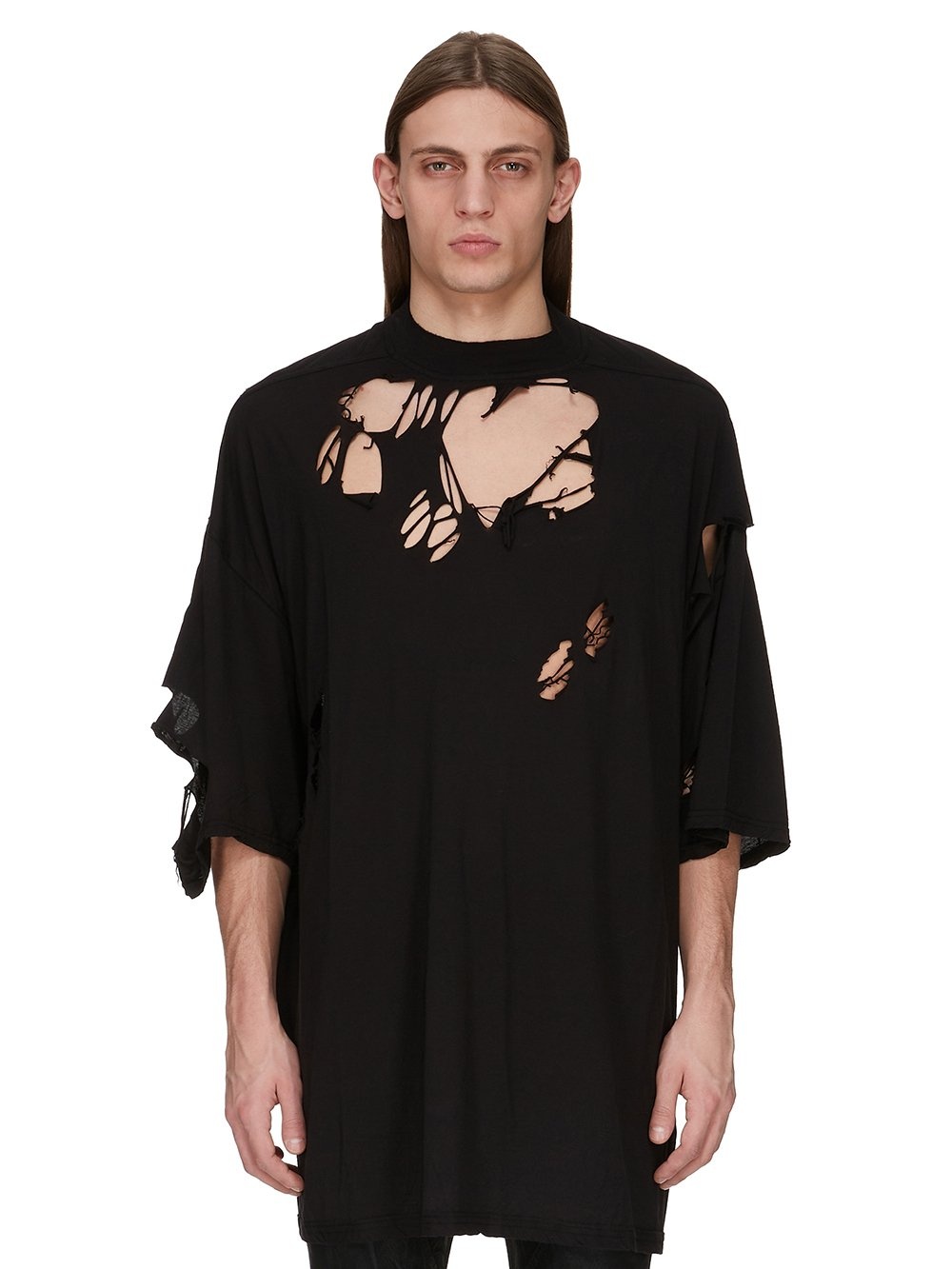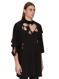 RICK OWENS SS25 HOLLYWOOD TOMMY T IN BLACK COTTON GAUZE JERSEY THIS TOMMY T IS BELOW HIP LENGTH WITH A JUMBO OVERSIZED FIT. IT HAS WIDE SHORT SLEEVES WITH A DROPPED ARMHOLE, RAW CUT HEMS AND A RIBBED CREWNECK. IT FEATURES SIGNATURE FRONT LEVEL SHOULDER SEAMS AND A CENTRE BACK SEAM THIS LIGHTWEIGHT AND AIRY COTTON GAUZE JERSEY IS SEMI TRANSPARENT AND HAVE A SOFT WASHED HANDFEEL. THE COLOR OF THIS JERSEY IS NATURAL WITH VISIBLE SLUBS AND IMPURITIES NATURAL TO THE COTTON FIBRE. THIS JERSEY IS GARMENT WASHED. THIS FABRIC IS MADE USING GOTS CERTIFIED ORGANIC COTTON WHICH MEANS THE NATURAL FIBER IS GROWN WITHOUT HARMFUL CHEMICALS, LEAVING OUR SOIL, AIR AND WATER CLEANER FROM CONTAMINATES COLOR: BLACK MATERIAL: 100% COTTON MODEL IS 189CM TALL ITEM IS AVAILABLE IN ONE SIZE