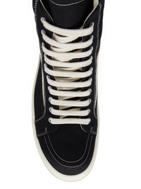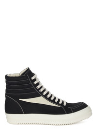 DRKSHDW FW24 PORTERVILLE HIGH VINTAGE SNEAKS IN BLACK/MILK/MILK 13OZ OVERDYED DENIM AND VELOUR SUEDE THESE HIGH VINTAGE SNEAKS ARE ABOVE ANKLE HEIGHT AND HAVE TEN EYELETS WITH LACES, TOE CAPS AND SHARK TOOTH SOLES THEY FEATURE A GRAPHIC LEATHER APPLIQUE ON THE SIDE FOOT, A PADDED ANKLE AND CONTRAST STITCHING THIS IS A COMBINATION OF 13OZ OVERDYED DENIM AND VELOUR SUEDE. THIS MEDIUMWEIGHT 13OZ DENIM IS OVERDYED AND HAS A SOFT AND WASHED HANDFEEL. THIS FABRIC IS MADE USING GOTS CERTIFIED ORGANIC COTTON WHICH MEANS THE NATURAL FIBER IS GROWN WITHOUT HARMFUL CHEMICALS, LEAVING OUR SOIL, AIR AND WATER CLEANER FROM CONTAMINATES - COLOR: BLACK/MILK/MILK - MATERIAL: UPPER 100% COTTON - LATERAL DETAILS 100% CALF LEATHER - LINING 100% COTTON - INSOLE 60% POLYURETHANE + 40% POLYESTER - SOLE 100% THERMOPLASTIC RUBBER