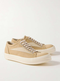 There are a few key details that mark these 'Vintage' sneakers out as a Rick Owens design, like the serrated rubber soles and the particular shape of the toes. They’ve been made in Italy from mustard denim and trimmed with geometric suede overlays. Style yours with the brand's drop-seat trousers or shorts. Size & Fit - Fits true to size. Take your normal size - European sizing Details & Care - Mustard denim, cream suede (Calf) - Lace-up - Designer colour: Mustard/ Milk - Style number: DU01D1803-SCFLVS