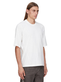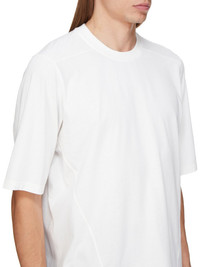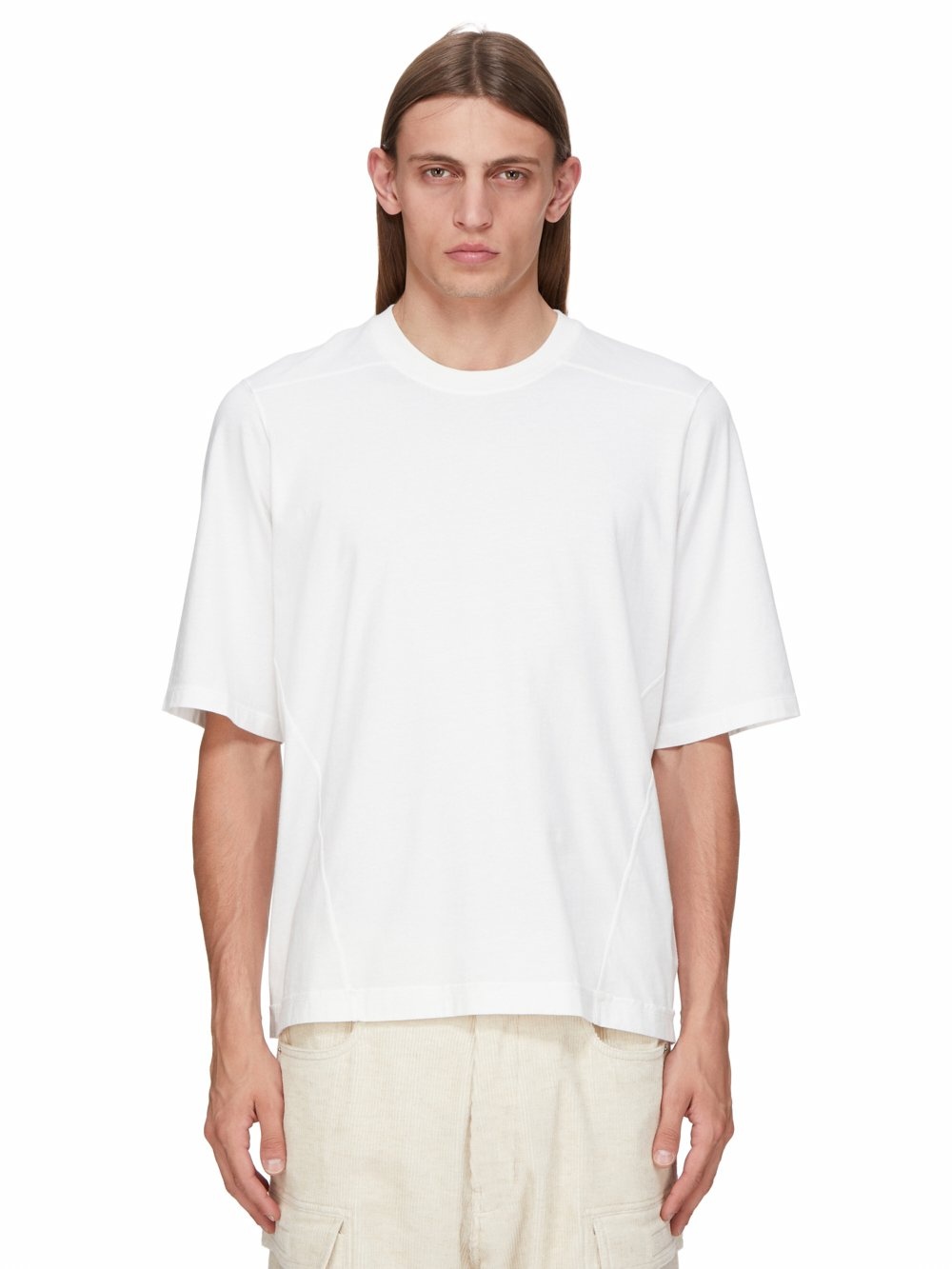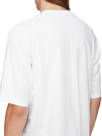 DRKSHDW SS25 HOLLYWOOD WALRUS T IN MILK MEDIUM WEIGHT COTTON JERSEY THIS WALRUS T IS BELOW WAIST LENGTH WITH A SLIGHTLY BOXY CUT, SHORT SLEEVES AND A RIBBED CREW NECK. IT FEATURES SIDE SEAMS THAT SLOPE TO THE FRONT BODY, CREATING A CONCAVE FRONT HEM. IT HAS SEAMING ON THE UPPER SLEEVE AND SIGNATURE FRONT LEVEL SHOULDER SEAMS AND A CENTRE BACK SEAM THIS MEDIUMWEIGHT COTTON JERSEY HAS A COMPACT AND DRY HANDFEEL. THIS JERSEY IS GARMENT DYEDTHIS FABRIC IS MADE USING GOTS CERTIFIED ORGANIC COTTON WHICH MEANS THE NATURAL FIBER IS GROWN WITHOUT HARMFUL CHEMICALS, LEAVING OUR SOIL, AIR AND WATER CLEANER FROM CONTAMINATES COLOR: MILK MATERIAL: 100% COTTON MODEL IS 189CM TALL ITEM IS AVAILABLE IN ONE SIZE