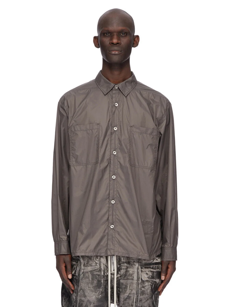 DRKSHDW FW25 CONCORDIANS JUMBO OUTERSHIRT IN BRONZE RECYCLED NYLON THIS JUMBO OUTERSHIRT IS BELOW HIP LENGTH WITH A JUMBO OVERSIZED FIT. IT HAS A CENTRE FRONT PLACKET WITH VISIBLE METAL BUTTONS, A CLASSIC COLLAR AND A HEMLINE WITH BEVELED SIDES SEAMS. IT HAS LONG SLEEVES WITH BUTTONED CUFFS, SIGNATURE LEVEL SHOULDER SEAMS AND A BACK YOKE. THIS AIRY AND LIGHTWEIGHT NYLON IS MADE USING GRS CERTIFIED RECYCLED NYLON WHICH ENSURES A REDUCTION IN WATER CONSUMPTION, EMISSIONS AND HAZARDOUS WASTE, LESSENING THE DEPENDENCE ON NON-RENEWABLE RESOURCES. COLOR: BRONZE MATERIAL:100% NYLON MODEL IS 189CM TALL MODEL WEARS SIZE S