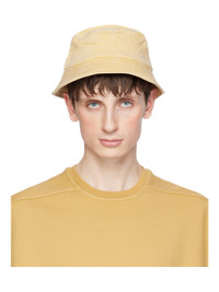 Lightweight over-dyed coated stretch denim bucket hat in yellow. · Fading throughout · Quilted brim · Cotton poplin lining Supplier color: Mustard Body: 90% cotton, 7% polyester, 3% rubber. Lining: 100% cotton. Made in Italy 241126M140009