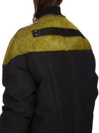 RICK OWENS FW23 LUXOR RUNWAY FLIGHT JKT IN MELANGE UNSHAVED COW LEATHER AND MOLESKIN THIS FLIGHT JKT IS HIP LENGTH WITH LONG SLEEVES. IT FEATURES A CENTRE FRONT ZIPPER WITH PLACKET AND TOP SNAP, SIDE SEAM POCKETS WITH SNAPS AND A RIBBED COLLAR, CUFFS AND WAISTBAND. IT FEATURES A GIRDERED SHOULDER AND YOKE IN CONTRAST FABRIC, DIAGONAL SEAM LINES RUNNING DOWN THE FRONT AND BACK BODY AND HAS A SIGNATURE COTTON WEBBING STRAP WITH RIVET DETAIL ON THE BACK YOKE THIS HEAVYWEIGHT DUVET VERSION IS FULLY LINED AND HAS TWO INTERNAL ZIPPERED POCKETS THIS IS A COMBINATION OF MELANGE UNSHAVED COW LEATHER AND MOLESKIN. THIS HEAVYWEIGHT LEATHER IS A HAIR-ON COWHIDE TREATED WITH A CORROSION TECHNIQUE THAT DECOLORS PARTS OF THE HAIR AND CREATE AN ACID AND BLACK MELANGE EFFECT. THIS PROCESS IS FULLY MANUAL AND THEREFORE EACH SKIN AND PRODUCT HAVE A UNIQUE PATTERN. THIS LEATHER IS TANNED IN THE VENETO AREA OF ITALY BY A TANNERY SPECIALIZED IN HAIR-ON COW LEATHER. BECAUSE THE HAIR IS NATURAL THERE CAN BE INCONSISTENCY IN THE LENGTH DIRECTION AND TEXTURE THIS TANNERY IS LWG CERTIFIED WITH A GOLD RATING. - COLOR: ACID MELANGE/BLACK - MATERIAL: 100% COTTON - INSERT SHOULDERS 100% COW REAL FUR - KNIT RIB COLLAR + WRIST BAND 97% CASHMERE + 3% WOOL - BODY LINING 97% COTTON + 3% ELASTANE - SLEEVES LINING 100% CUPRO - POCKETS LINING 100% COTTON - PADDING 90% GOOSE- MODEL IS WEARING SIZE 48 - MODEL IS 189 CM TALL