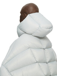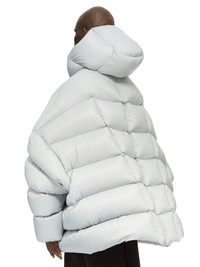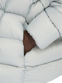 RICK OWENS FW24 PORTERVILLE JUMBO HOODED PETER IN PALE BLUE RECYCLED NYLON THIS JUMBO HOODED PETER IS BELOW HIP-LENGTH WITH AN OVERSIZE FIT. IT IS A HEAVYWEIGHT DUVET QUILTED WITH DIAGONAL STITCHING LINES. IT FEATURES A CENTRE FRONT ZIPPER WITH PLACKET AND TOP SNAP, LEVEL SHOULDER SEAMS AND YOKE, LONG SLEEVES WITH LOW SHOULDERS AND A DROPPED ARMHOLE. IT HAS TWO SIDE SEAM POCKETS WITH SNAPS AND A HOOD. THIS AIRY AND LIGHTWEIGHT NYLON IS MADE USING GRS CERTIFIED RECYCLED NYLON WHICH ENSURES A REDUCTION IN WATER CONSUMPTION, EMISSIONS AND HAZARDOUS WASTE, LESSENING THE DEPENDENCE ON NON-RENEWABLE RESOURCES - COLOR: PALE BLUE - MATERIAL: 100% NYLON - KNIT RIB CUFF 100% NEW WOOL - POCKETS LINING 100% COTTON - PADDING 90% GOOSE DOWN + 10% MALLARD FEATHERS - MODEL IS 189CM TALL - MODEL WEARS SIZE 48